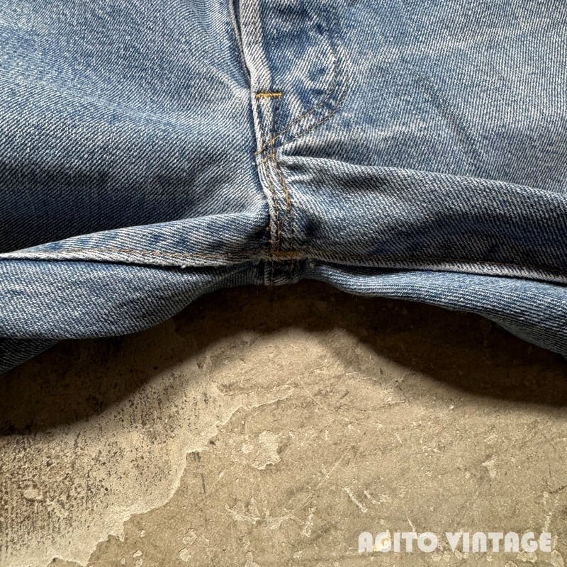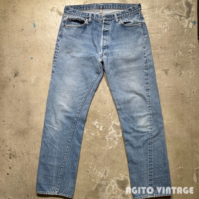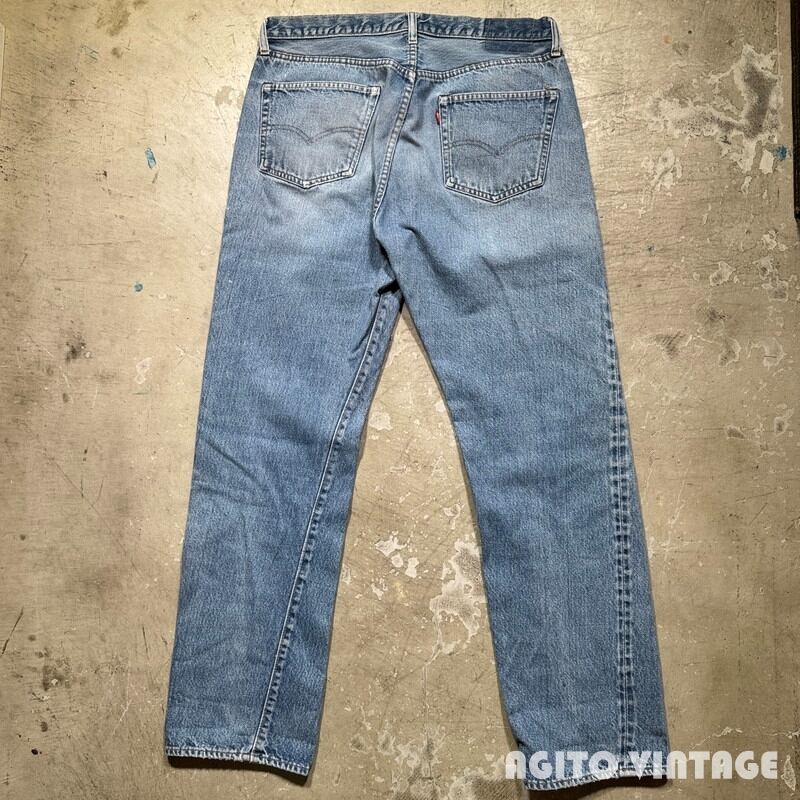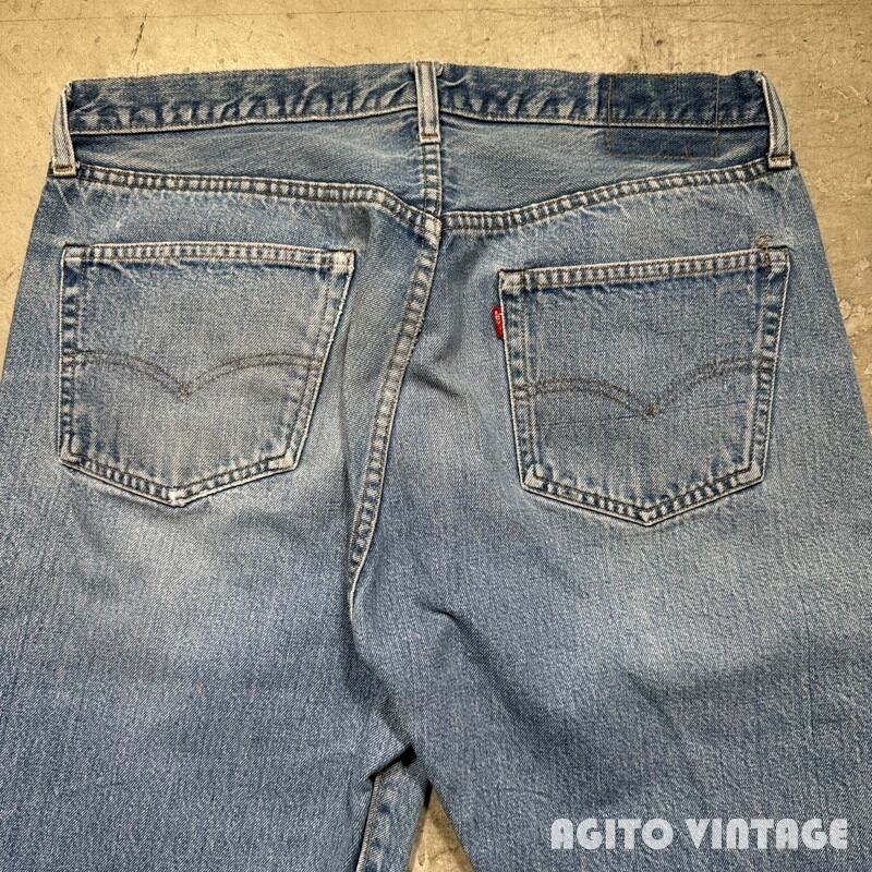 70年代のLevi's 501デニムパンツです。トップボタン裏刻印6、縮率8%、79年製、アウトシームセルヴィッジ、赤タブスモールe、バックポケット裏チェーンステッチ。所謂66後期モデルのこちらは色残り2~3割程でムラ感の残る色落ちです。薄汚れやペンキ汚れの様な箇所が見られます。裾等に細かな擦れはございますが、目立つダメージ等無くコンディションは良好です。ウエスト表記はW38ですがこちらも実寸W35インチ程でレングスもオリジナルだと思われます。ややのっぺりとした色落ちですが生地はしっかりとしていますので長くご愛用頂ける1本です。程よくゆとりのあるサイズ感ですのでオススメです。