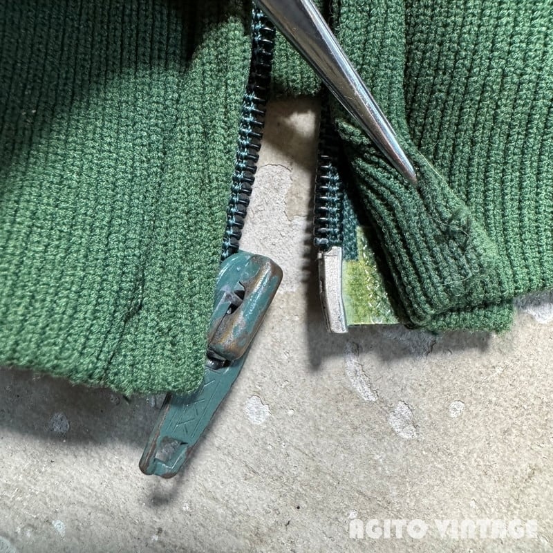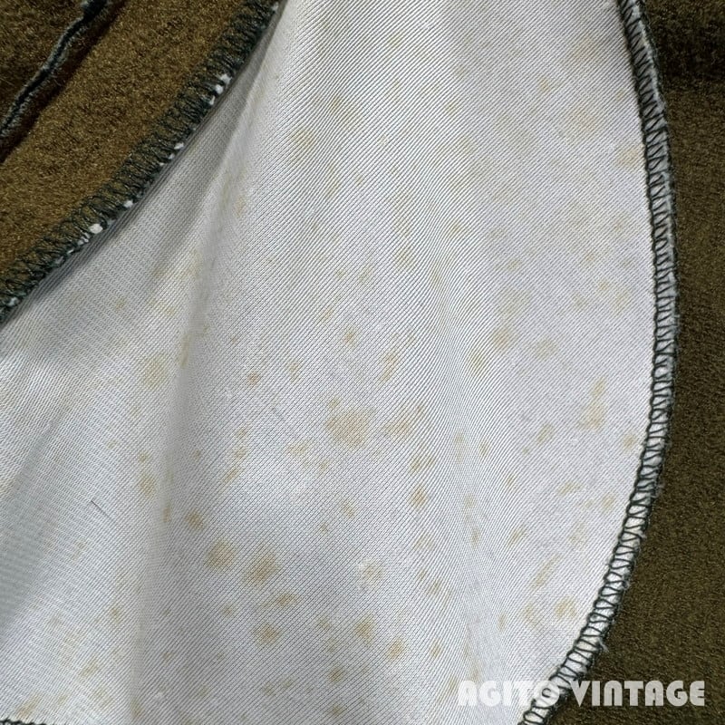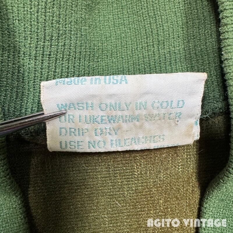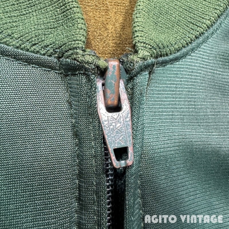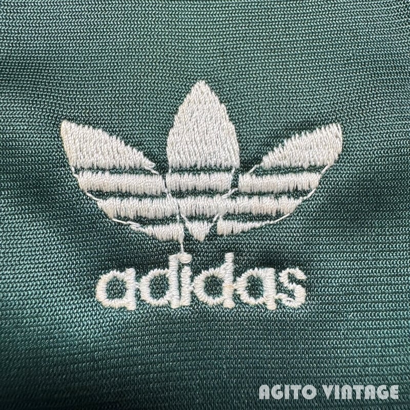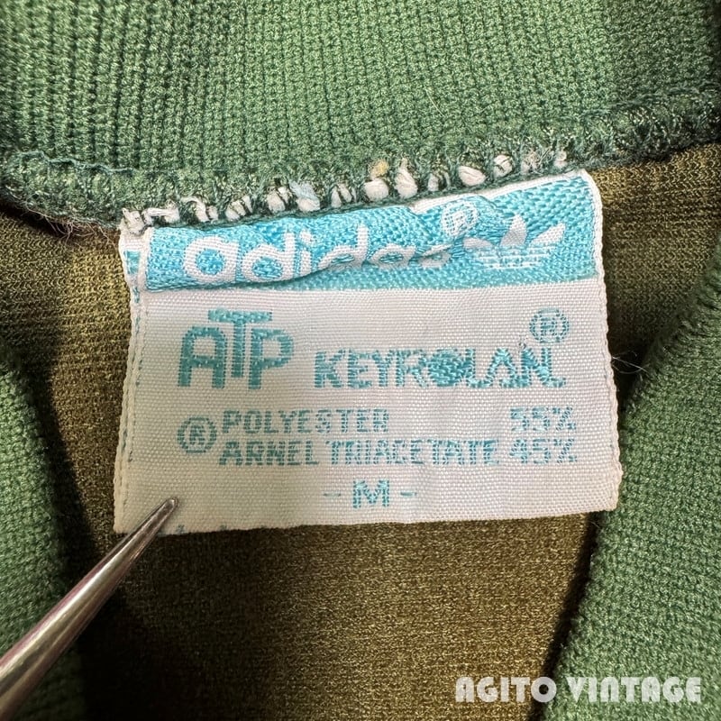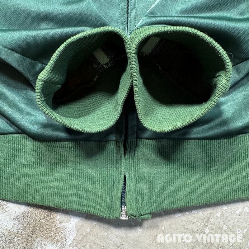 70年代後半から80年代頃のadidas ATP トラックトップジャージです。ATPとは1972年に発足した男子プロテニス協会の略です。KEYROLAN表記が入るUSA製モデルです。暗めのグリーンに明るいミントグリーンの3本ラインが映える1着です。フロントを中心に小さなシミがいくつか見られます。ポケットの裏生地などにも薄汚れがございますが目立つダメージは無く生地のコンディションは良好かと思います。M表記ですので男女共に着れる良いサイズ感だと思います。ダークグリーン×ミントグリーンの組み合わせは少し新鮮な印象ですので、ATPシリーズのジャージをお探しだった方は是非いかがでしょうか。