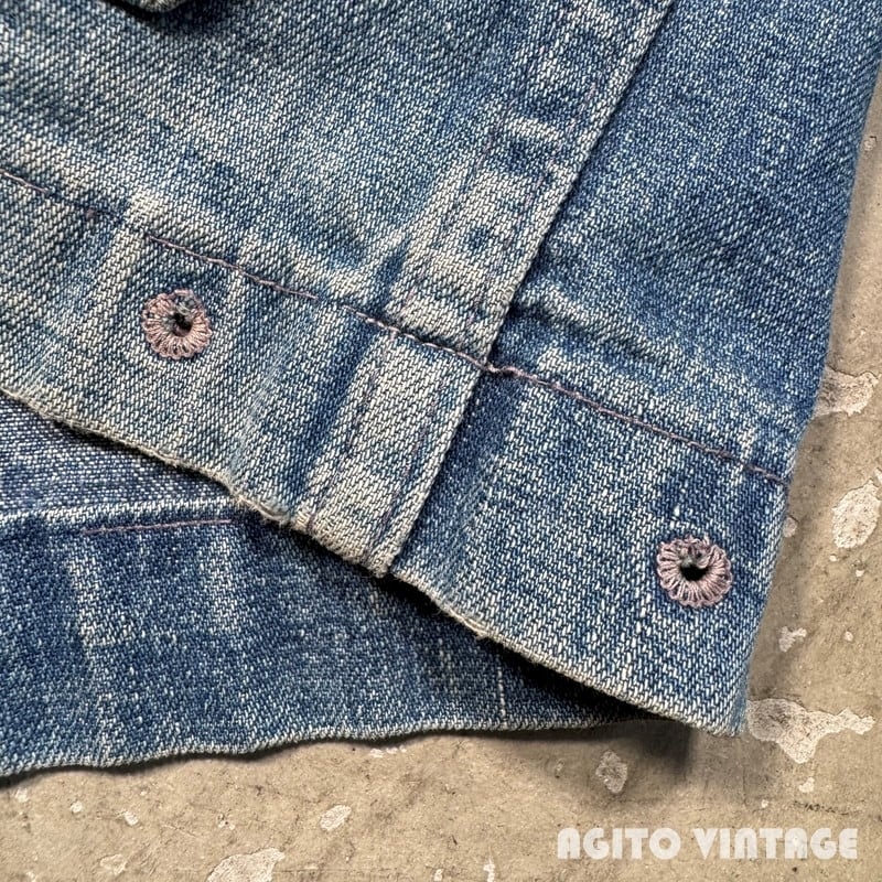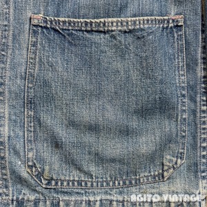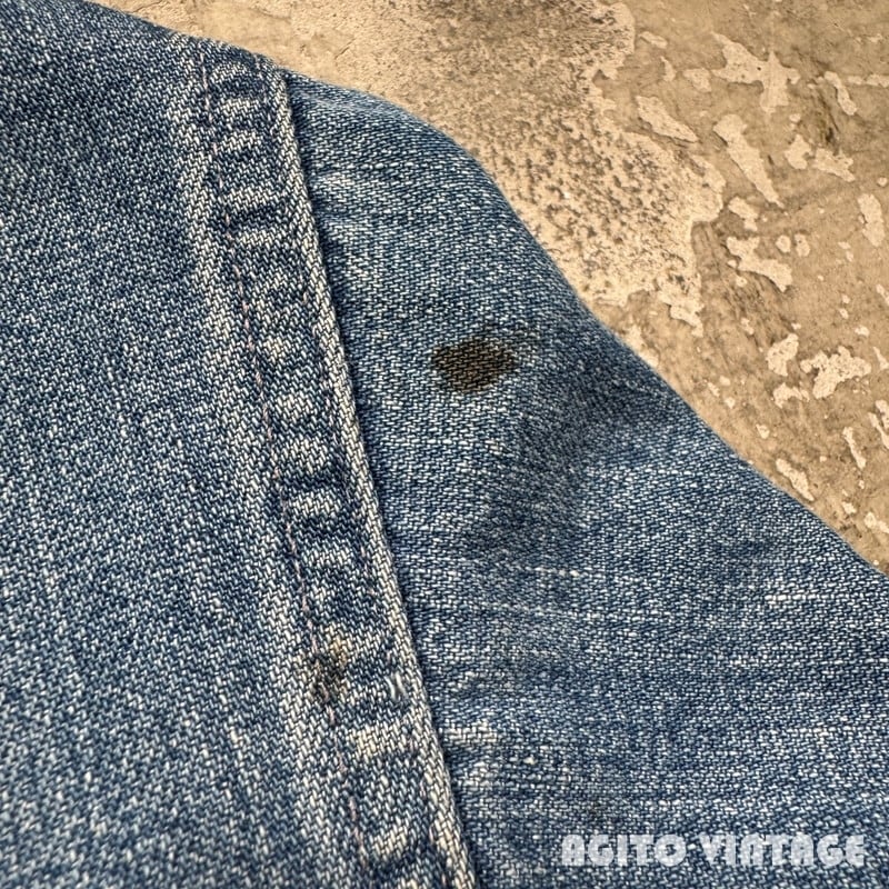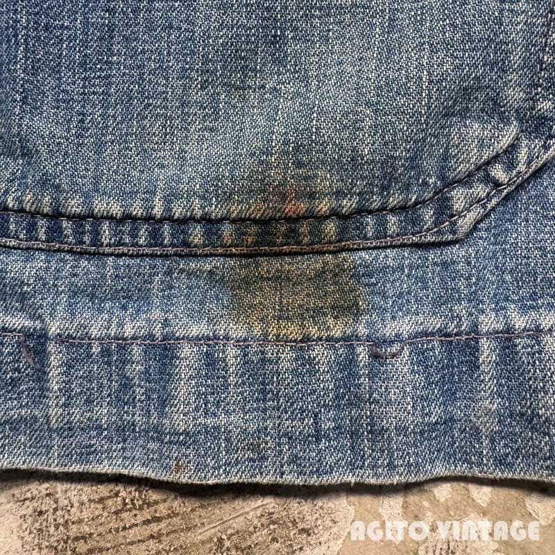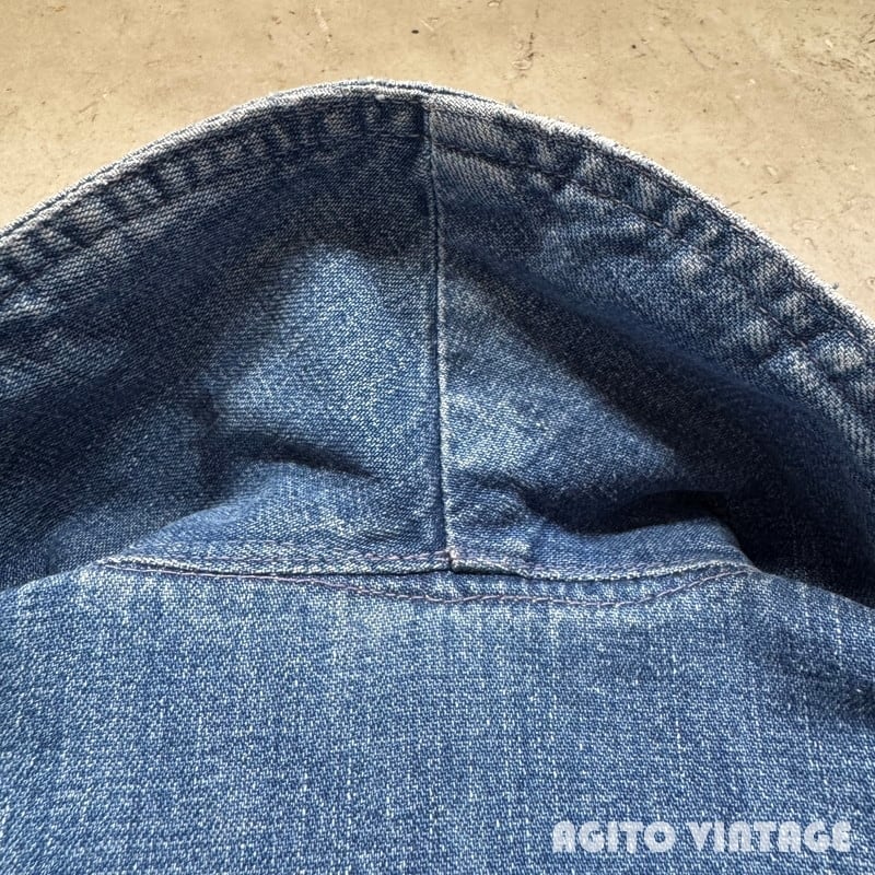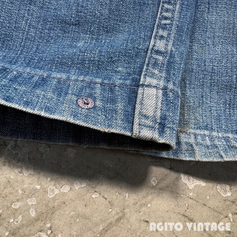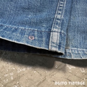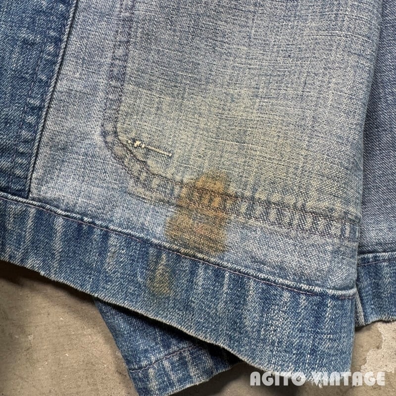 40年代頃のU.S.NAVYショールカラーデニムカバーオールです。第二次世界大戦時に作業服として兵士が着用していたアイテムで、U.S.NAVYを代表する名作です。ライトオンスデニムが使用され、フロントはチェンジボタンとなります。チェンジボタンは2箇所が古いメタルボタンが使用されており、その他は樹脂ボタンとなります。色味は3割程でライトオンスデニムらしい縦落ちが顕著に見られます。左袖に1cm大と5mm大のダメージがございます。ポケット下部と右袖に目立つシミ汚れがございます。その他薄汚れや細かな擦れ等ございます。サイズはやや小さめで36相当でしょうか。ボタンの交換や袖にダメージはございますが、雰囲気の良い個体ですのでサイズが合う方は是非この機会にいかがでしょうか。
