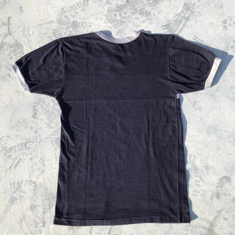 80年代のChampion 切り替えリンガーTシャツです。胸元の切り替えが特徴的で、ネイビーとグレーのリンガーがお洒落です。後期のトリオタグですので、84~86年くらいの物と思われます。全体に使用感はございますが、ダメージや目立つ汚れはございませんので、比較的美品の部類です。Lサイズ表記ですが、実寸はMサイズくらいです。チャンピオン好きにおススメです。
