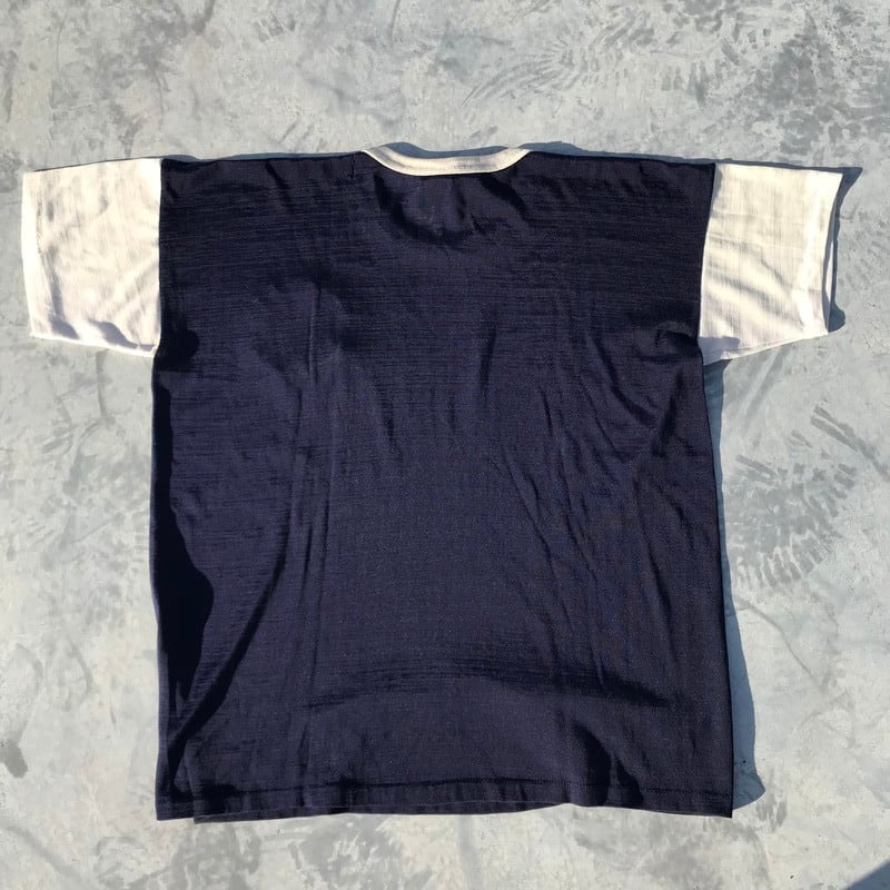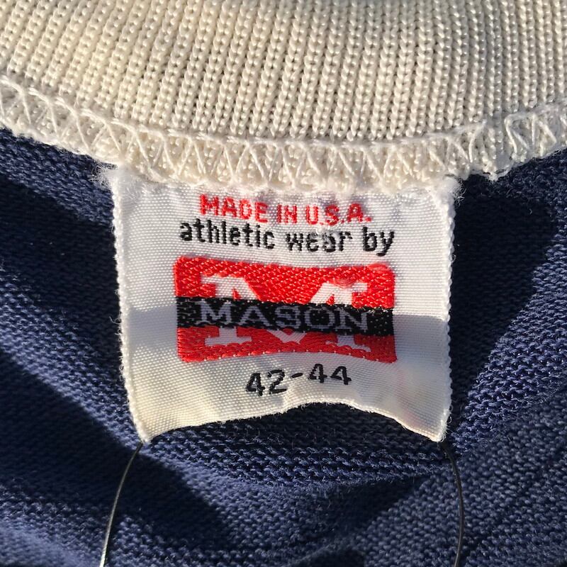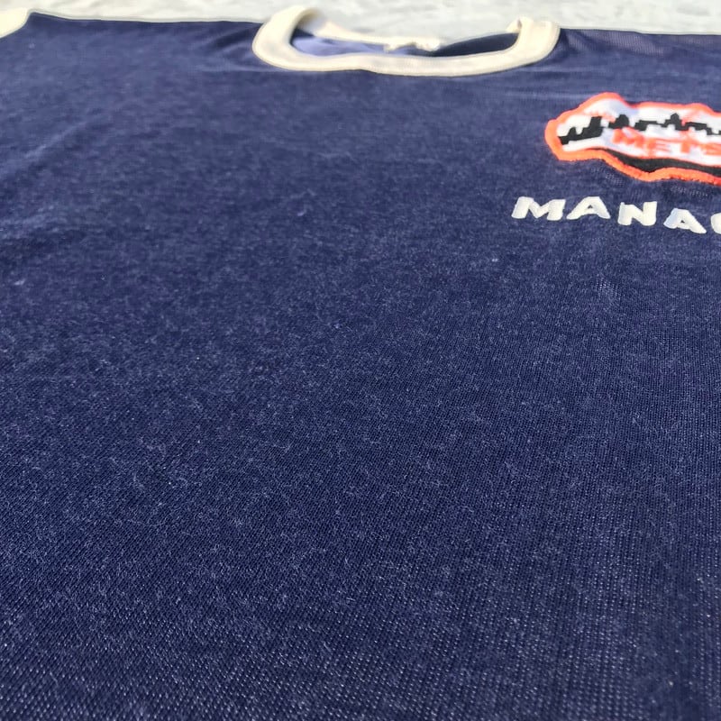 60年代頃のMASON レーヨン袖切り替えTシャツです。レーヨン素材で伸縮性、通気性に優れています。胸元にMETSのワッペン、その下にMANAGERのプリントがある事から、大リーグのMets関係者に支給されていた物ではないでしょうか。身幅が広くBOX型のようなシルエットでゆったり目な作りとなっています。左首元に糸抜けか、3cmくらい筋が入っています。スポーツ系のレーヨンTシャツがお好きな方は是非。