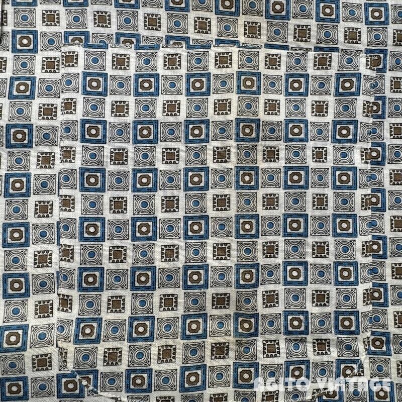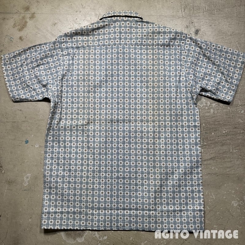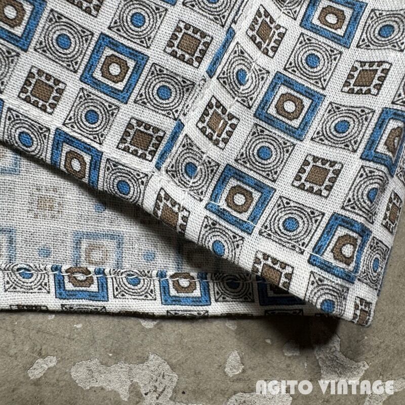 60年代頃のTOWN TOPIC プリントコットンシャツです。ブランドの詳細は不明ですがタグに「A Quality Product for over 80 years」と記載があるので1880年頃には創業していたと思われます。ご紹介するこちらは紙タグが付く希少なデッドストック品です。元々折りたたまれた状態で保管されていましたが、押さえ針で留められいたので丁寧に取り外し軽くスチームアイロンをかけています。ループボタンは付きませんが開襟スタイルで着用していただけます。押さえ針で固定されていた箇所には小さな穴が開いています。コットン地に三種類の小紋柄がプリントされています。畳まれた状態で長期保管されていた個体ですので畳みヤケが見られます。Sサイズ表記です。コットン100%なので洗うと多少縮みがあると思われます。小さめサイズをお探しだった方は是非この機会にいかがでしょうか。こちらはもう1点と比べるヤケが少し目立つので価格は少し下げています。