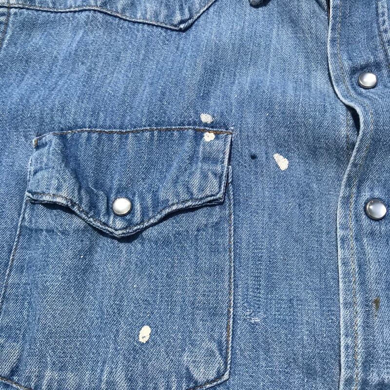 70年代頃のSears ROEBUCKデニムウェスタンシャツです。アメリカの3大ストアで知られるSears ROEBUCKは、HERCULESを始め様々なプライベートブランドを展開しています。こちらのシャツは柔らかいコットン生地で、全体も程よくフェードしており雰囲気の良い1着です。所々にペンキが飛んでおり、襟に1か所小さなリペアがございます。XL表記ですが、Lサイズ位の着用感です。ベイカーパンツ等と合わせてみてはいかがでしょうか。