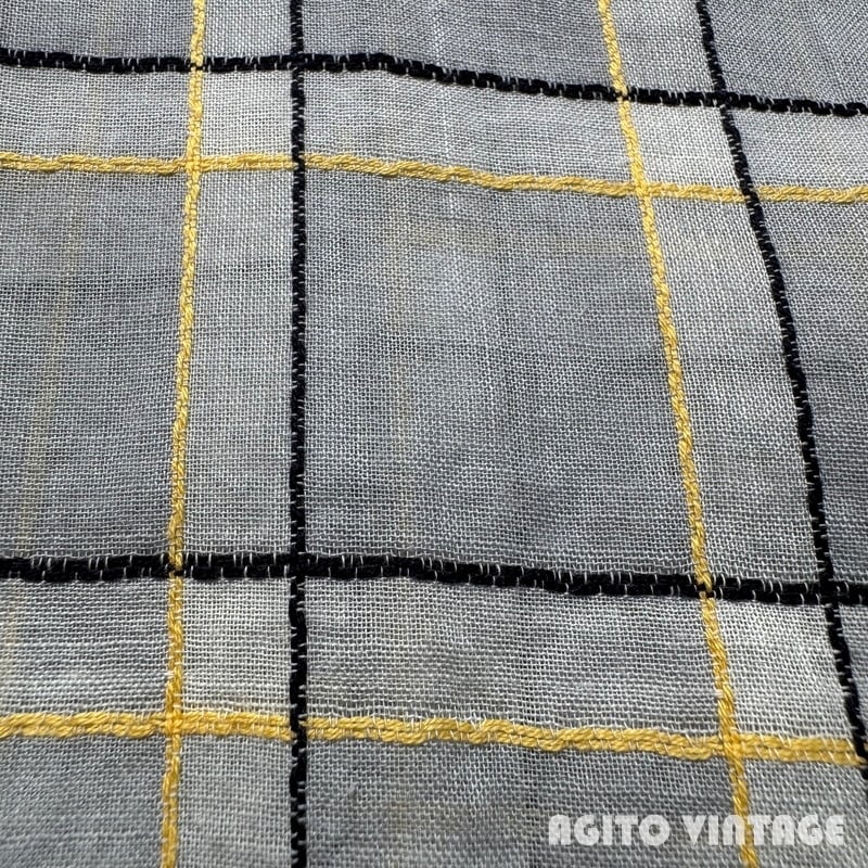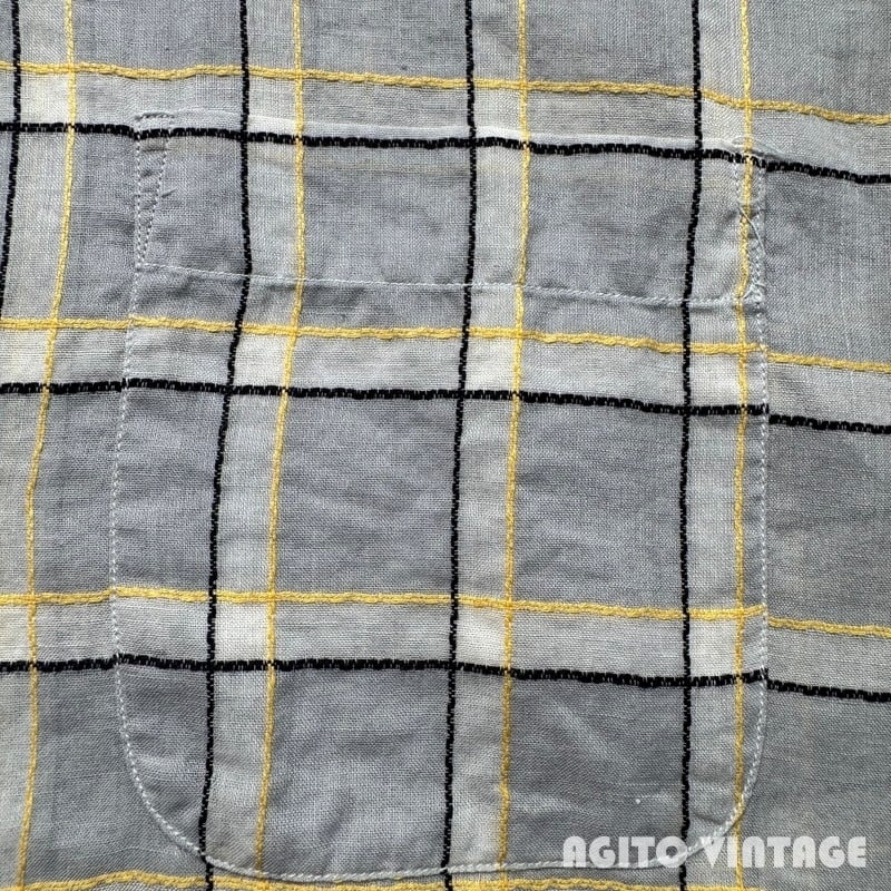 60年代頃のVAN HEUSENオープンカラーシャツです。VAN HEUSEN は1881年に創業した140年以上続く老舗アメリカンシャツメーカーです。ご紹介するこちらは、襟芯でループボタンが付く開襟仕様です。パッチポケットが両胸に付きます。素材は恐らくコットンで、やや透け感のあるシアー地です。黒と黄色の撚り紐が生地に縫い込まれたようなデザインです。生地特有のシワ感はございますが、目立つ汚れやダメージは特に無くコンディションの良い1着です。M表記で一般的なサイズ感だと思います。涼し気な生地感ですので猛暑が続く真夏にピッタリなアイテムです。透け感があるのでインナーは無地がオススメです。