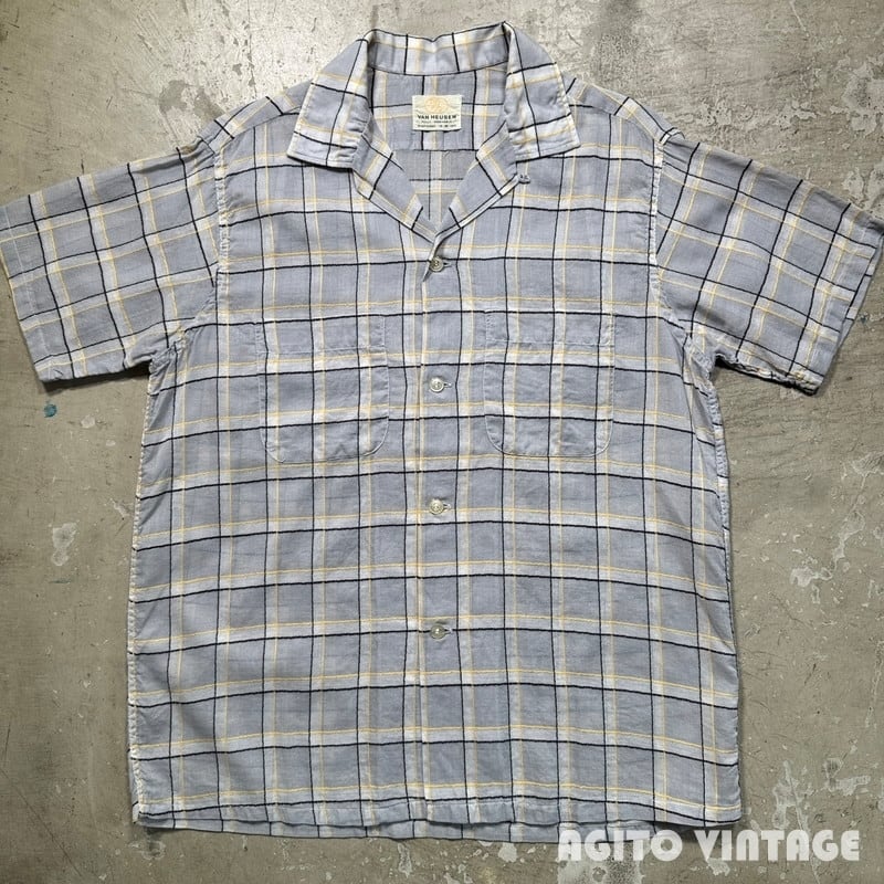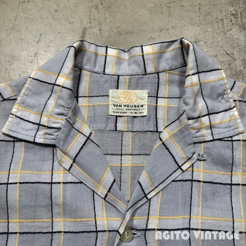 60's VAN HEUSEN ヴァンヒューゼン オープンカラーシャツ シアーシャツ チェック柄 開襟 襟芯 グレー Mサイズ 希少 ヴィンテージ BA-2811 RM3232H