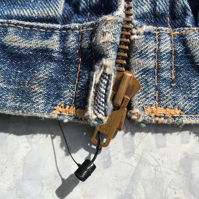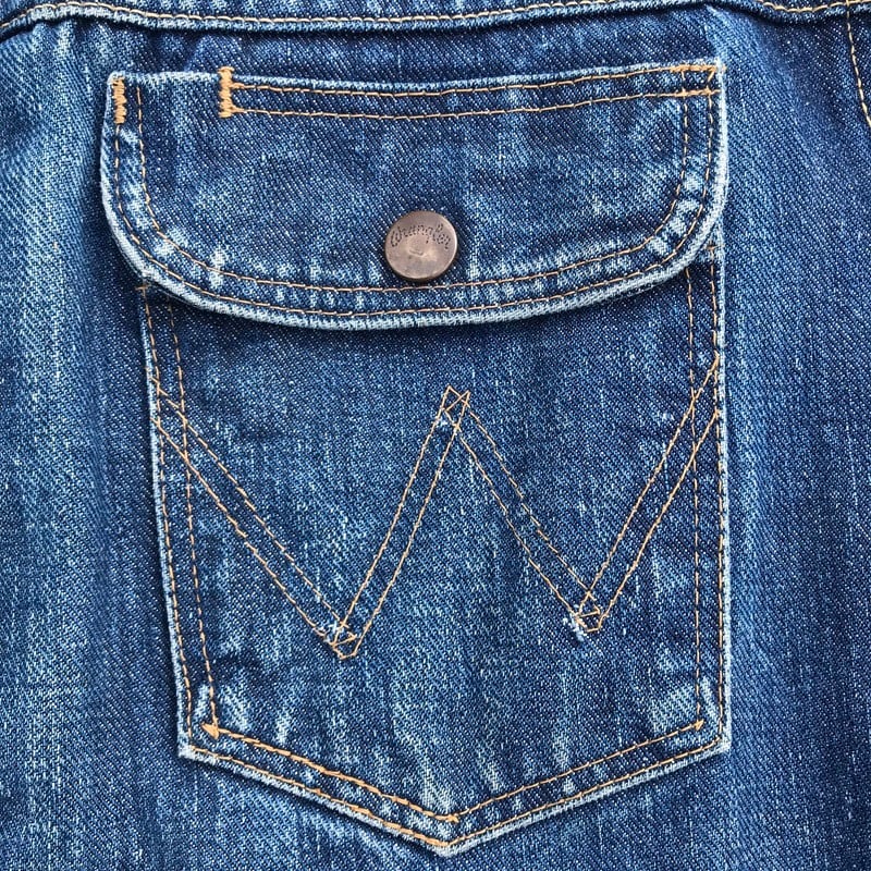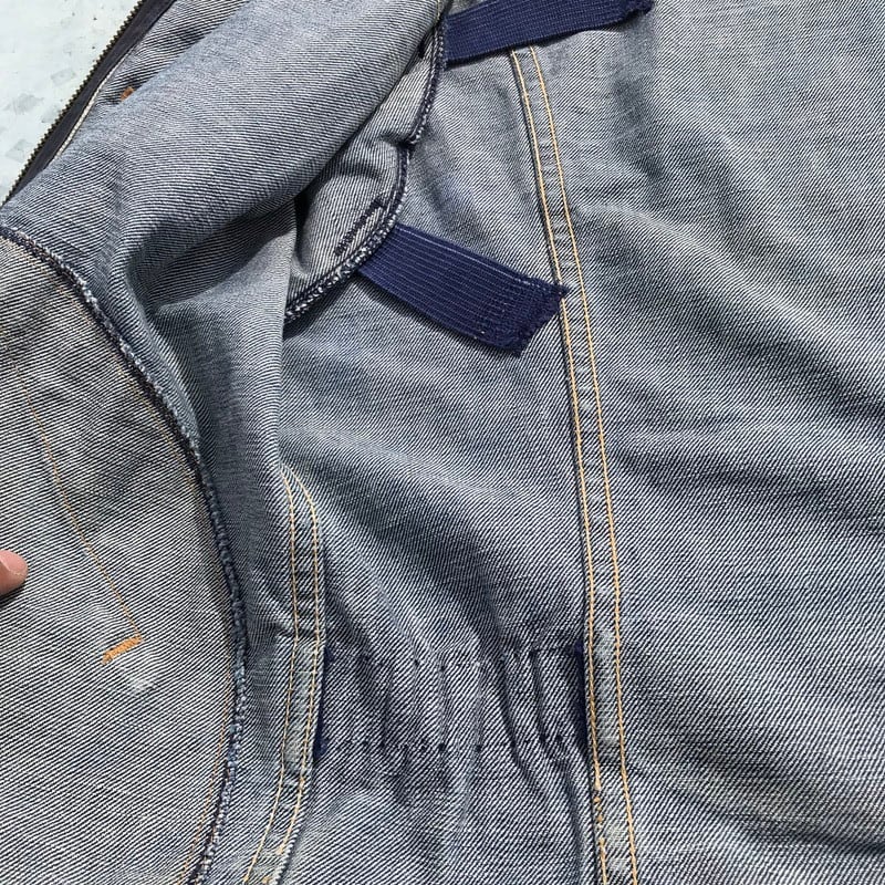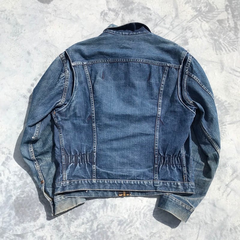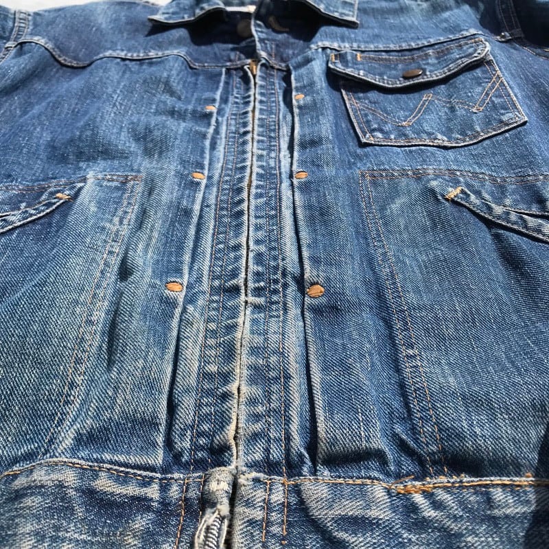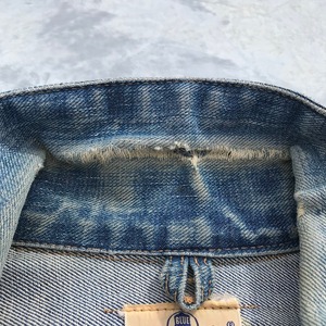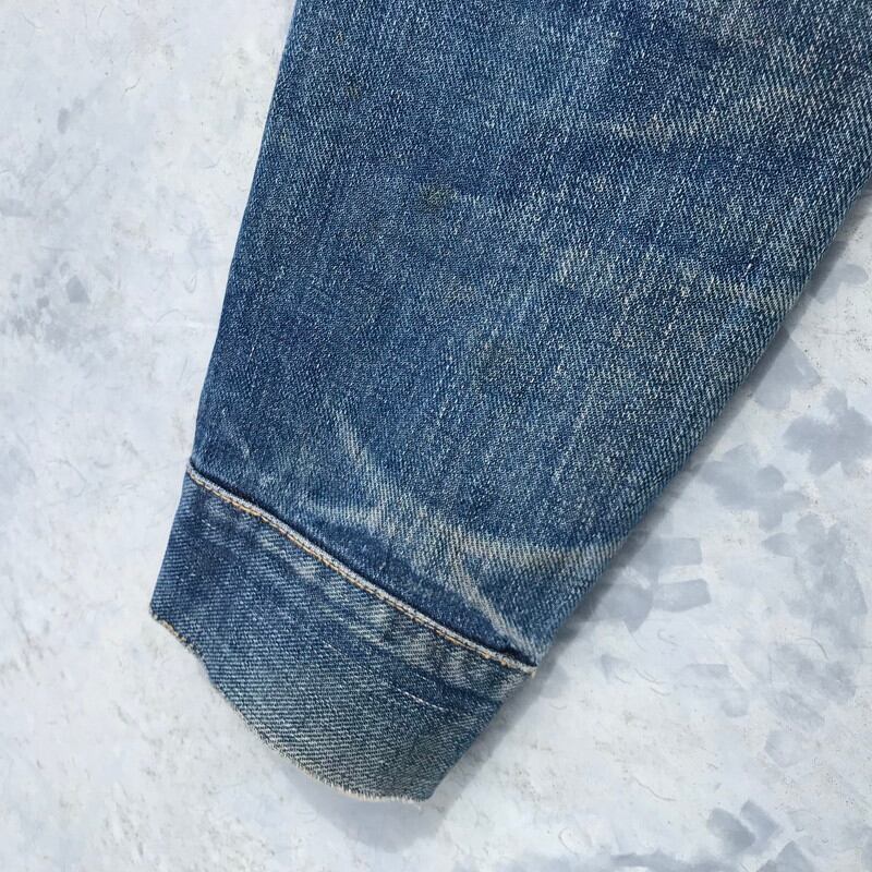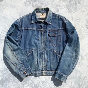50年代から60年代頃のWrangler 11MJZデニムジャケットです。1956年に登場した11MJZは前期後期に分類されますが、こちらはその前期モデルにあたります。トップはボタンホールのあるタイプで、タグは縦ベルにサイズ表記が右下に表記、®マーク入り、ペン差し付きのフラップポケット、袖口のリベット留め、内側のゴムバンドはネイビー。ジッパーは棒TALONを使用。ゴムバンドの下段が左右欠損しています。首元と袖口スレによるダメージ有り。