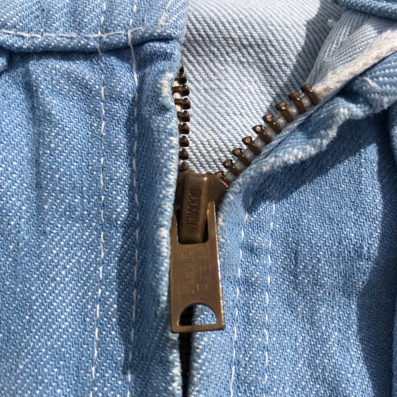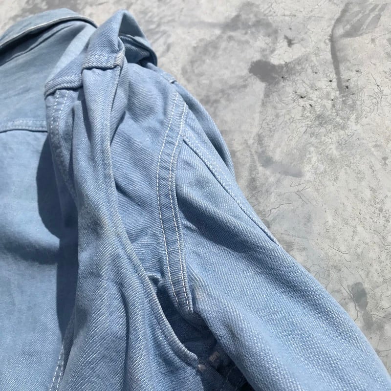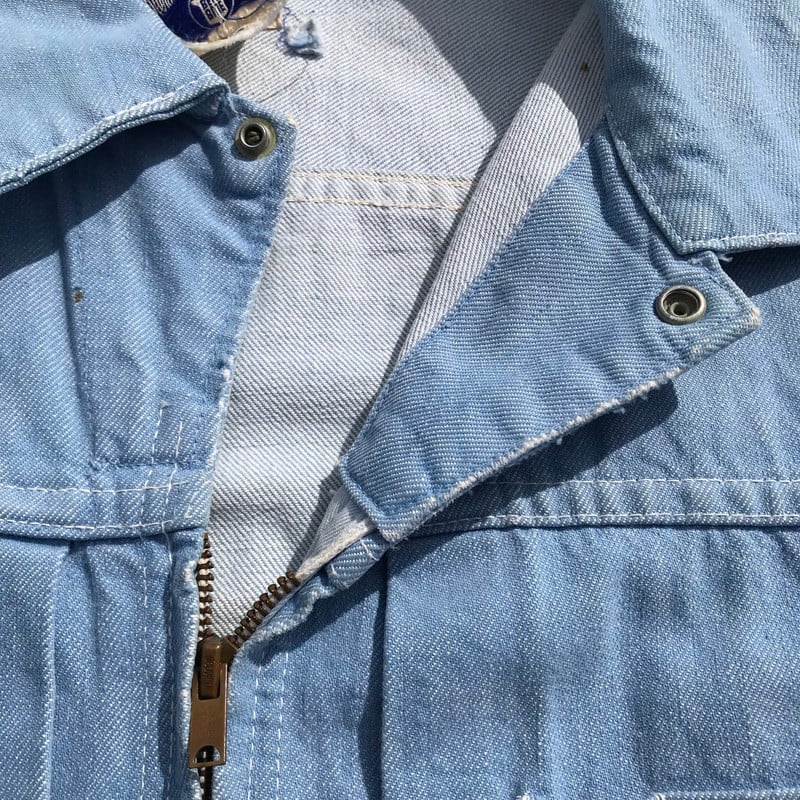 60年代頃のWrangler 22MJZデニムジャケットです。1956年に登場した11MJZは前期後期に分類されますが、こちらはその後期モデルにあたります。前期との違いはトップはスナップボタン、袖口のカンヌキ留め、内側のゴムバンドはグレーへと変更になっています。あまり見かけないサックスブルーデニムで、淡い色合いが印象的です。ジッパーはSCOVILとGRIPPER ZIPPERのWネーム。タグの上部が外れています。首元と袖口に擦れ、右袖ニ、2cm大の穴が開いております。