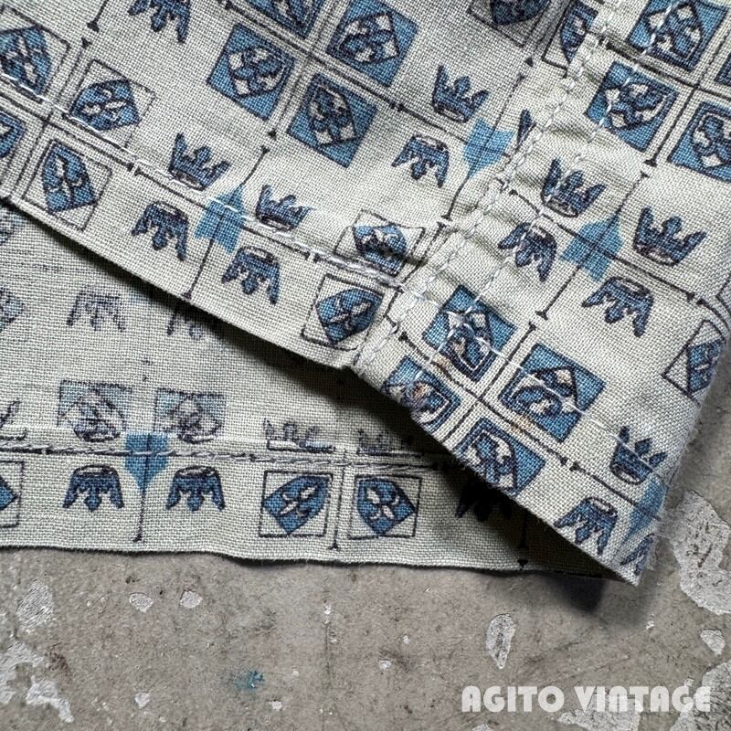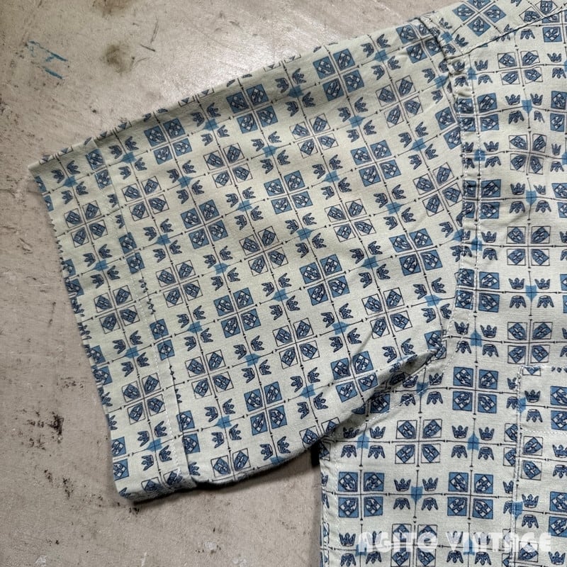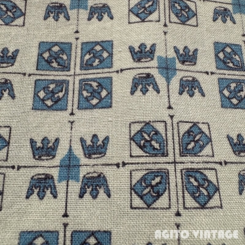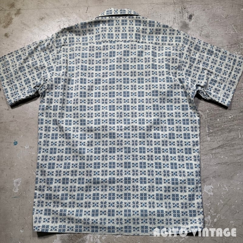 60年代頃のSEARSプリントコットンオープンカラーシャツです。SEARSはアメリカ3大ストブランドで知られるGMS(ゼネラルマーチャンダイズストア)です。ご紹介するこちらは襟芯が入りループボタンの付かない開襟仕様のシャツです。エンブレムや王冠の小さな柄が全面にプリントされています。両胸にパッチポケットが付きます。全体的にやや色褪せがございますが目立つダメージや汚れは特に無くコンディションは良好です。S表記で身幅が細目な作りをしています。サイズ感が合う方は是非この機会にいかがでしょうか。