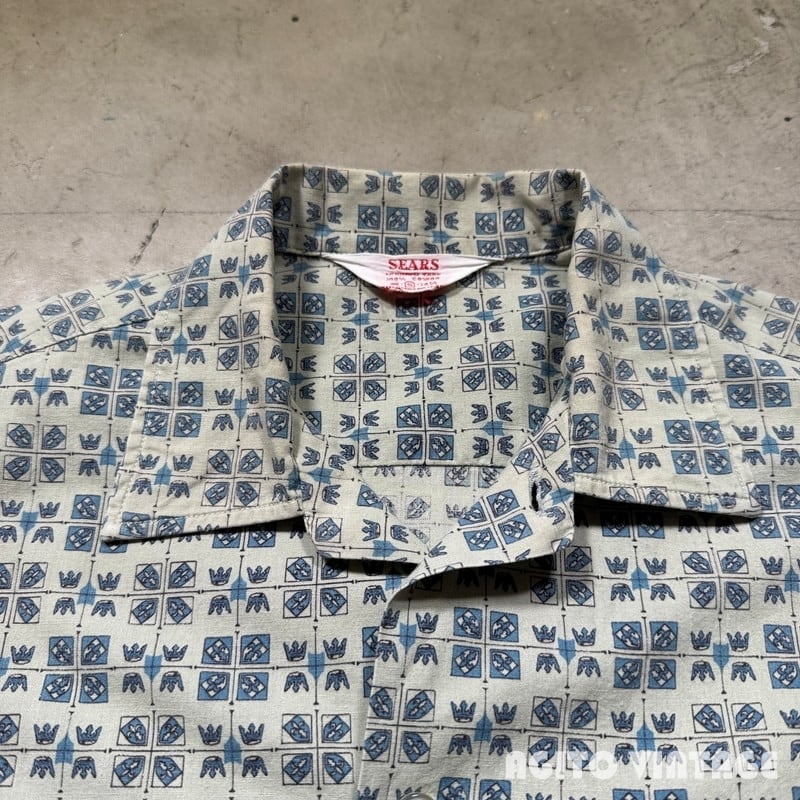 60's SEARS シアーズ プリントコットンオープンカラーシャツ 襟芯 エンブレム 王冠柄 ブルー ストアブランド Sサイズ 希少 ヴィンテージ BA-2816 RM3237H