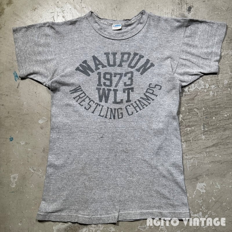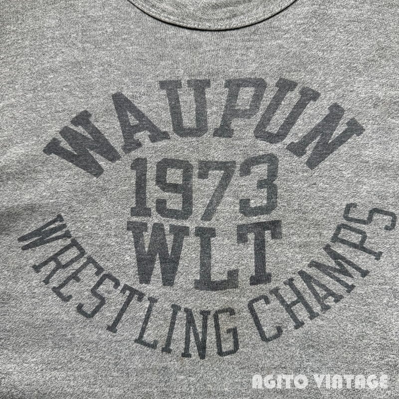 70's Champion チャンピオン 88/12 染込み4段プリントTee WAUPUN 1973 WLT WRESTLING CHAMPS 杢グレー USA製 XS相当 希少 ヴィンテージ BA-2825 RM3246H