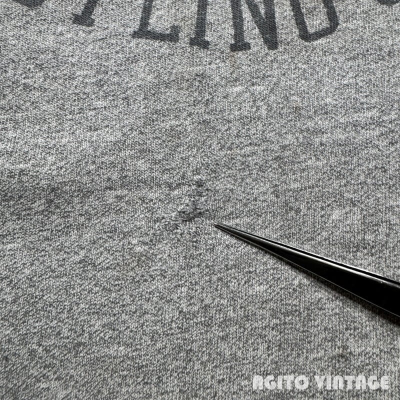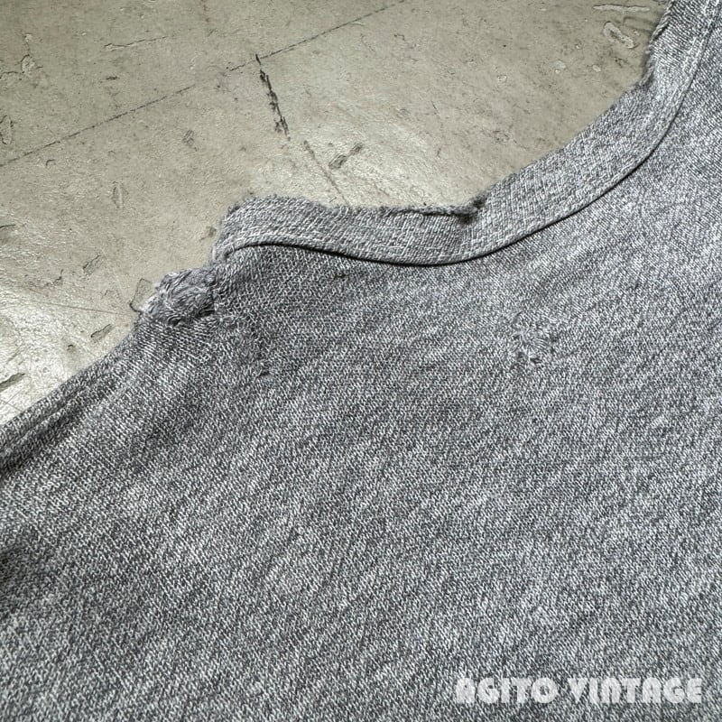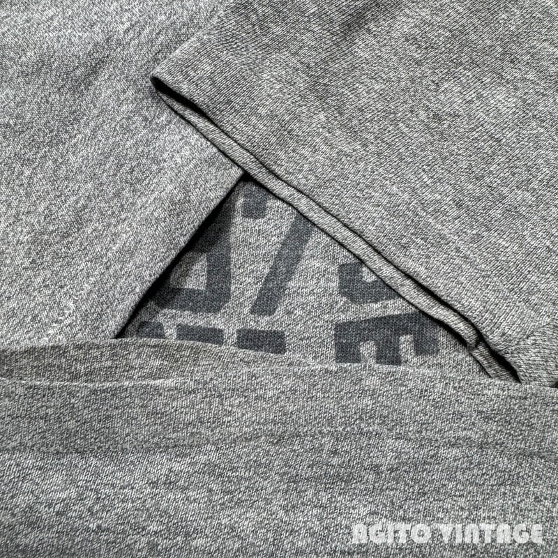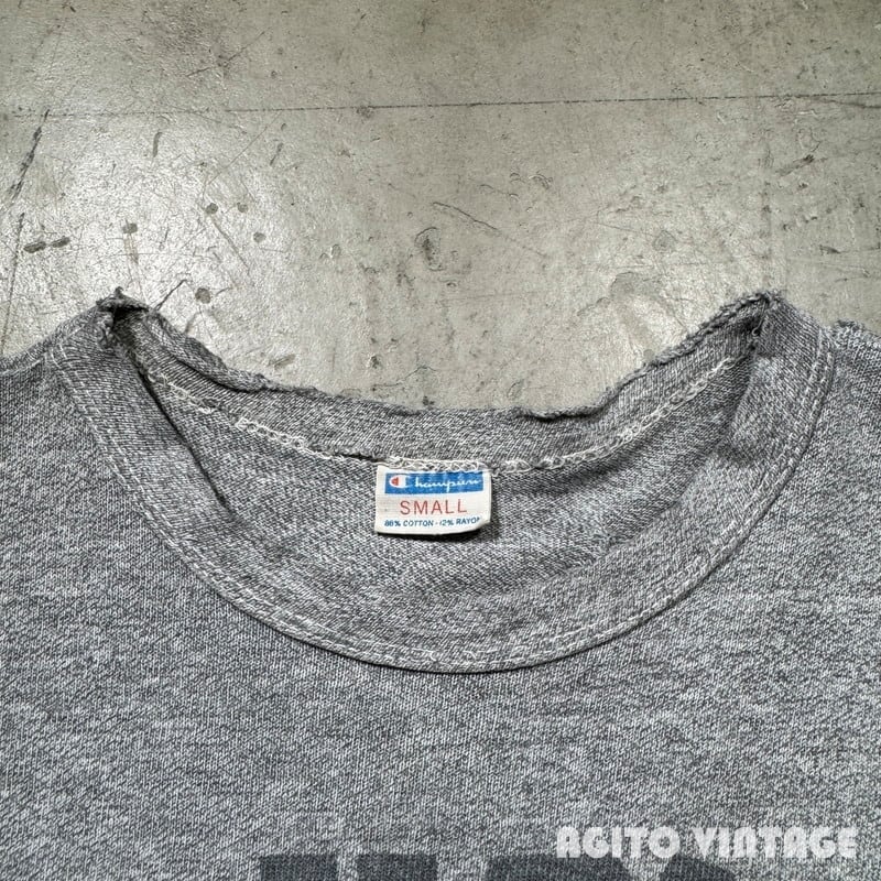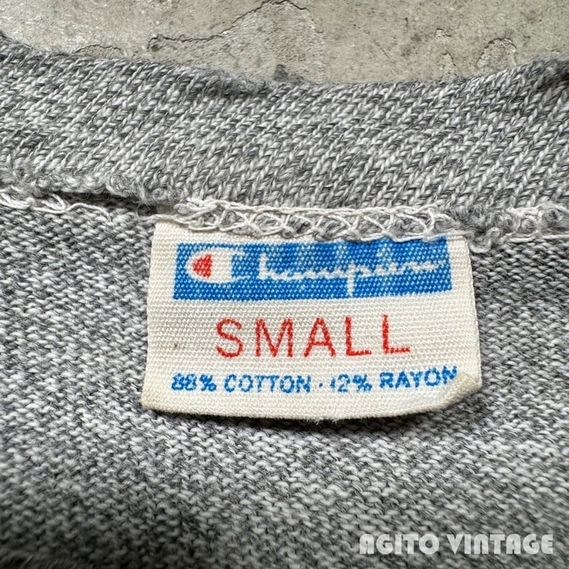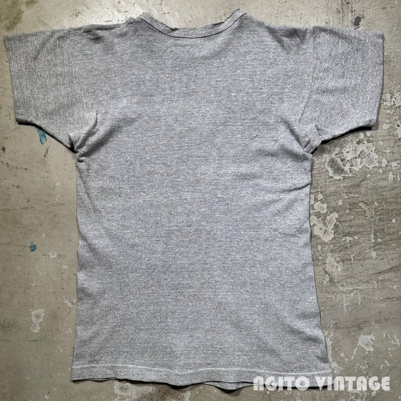 70年代頃のChampion 88/12ボディTeeです。バータグが付くUSA製です。ヴィンテージチャンピオンのTシャツでも人気の高いコットン88%レーヨン12%の混紡ボディで、フロントには染み込みで4段のプリントが入ります。WLT(WISCONSIN LITTLE TEN)というスポーツカンファレンスの中のレスリング大会に出場したWAUPUN高校の物だと思われます。首周りに擦れやダメージがあり、脇やフロント、背面には小さなダメージを補修した跡がいくつかございます。SMALL表記ですが強く縮んでいますのでXSもしくはもう少し小さいサイズ感だと思われます。男性ですとかなり細身な方でないと着用は厳しいかもしれません。細身の女性だとバランスよく合わせていただけるかもしれません。ベイカーパンツ等と合わせる最高にカッコ良いかと思います以。小さいサイズですのでディスプレイとしも良いかもしれません。雰囲気の良い個体ですのでお好きな方は是非この機会をお見逃しなく。この面でサイズがもう少し大きければ倍ぐらいの価格をつけていたかもしれません。サイズが合う方は本当に羨ましいと思う1着です。