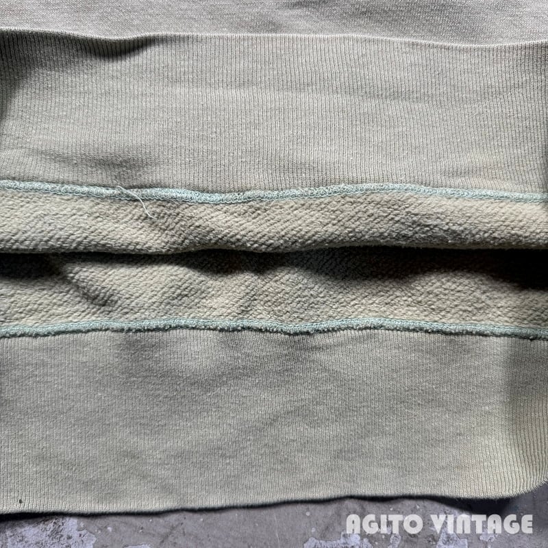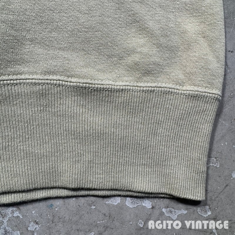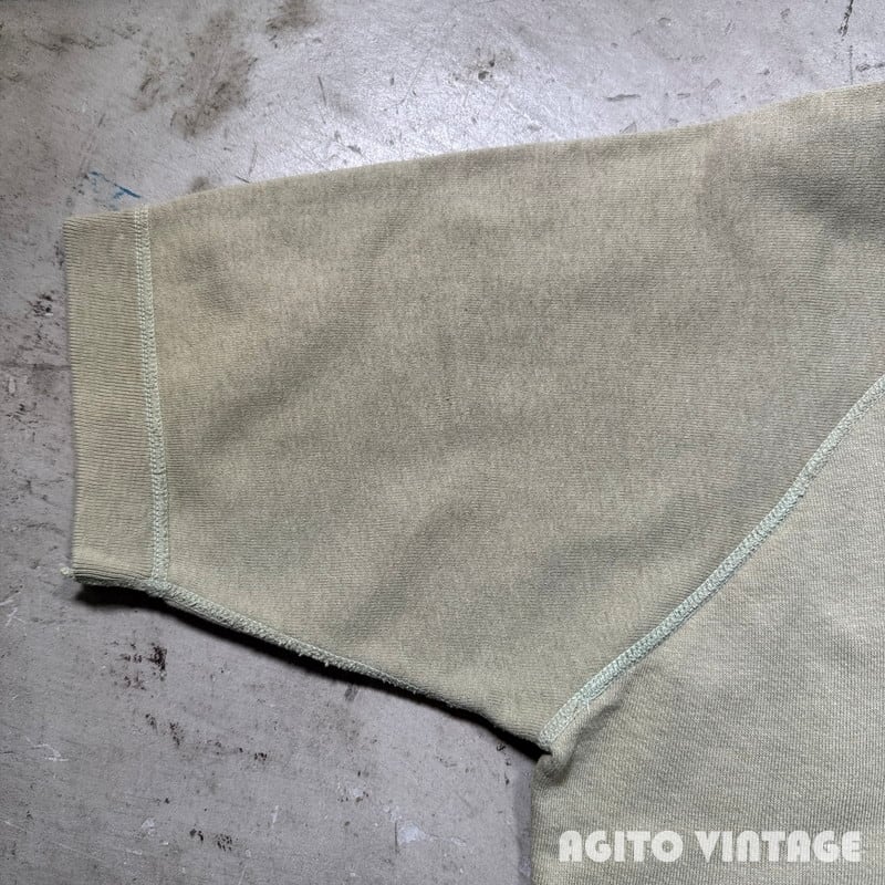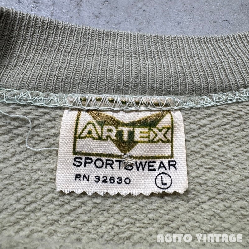60年代頃のARTEX S/Sカレッジスウェットです。ブーメラン型のデザインが入るタグが付きます。鶯色を薄めたようなライトグリーンボディで、ネックと裾は2本針、その他は4本針で縫製されています。フロントとバックの両面にプリントが入ります。バックプリントはフロントプリントを反転した凝ったデザインです。ネック付近に小さなダメージがあり、背面に小さなブリーチ跡が見られます。その他使用感はございますがコンディションの良い個体だと思います。L表記で縮みも少なく比較的大きいサイズ感です。現代では使えなくなってきたインディアンのプリントが入りますのでお探しだった方は是非この機会にいかがでしょうか。