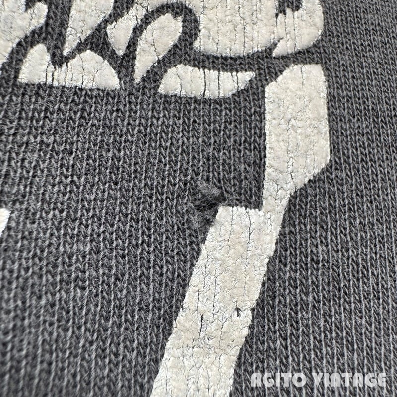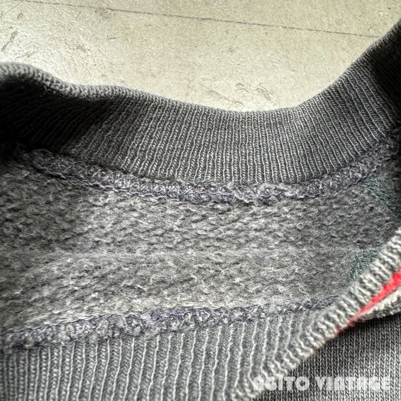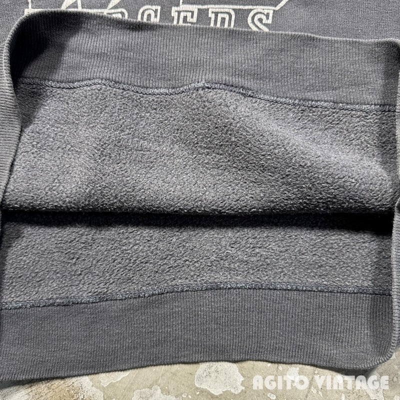 60年代頃のUnknown S/Sカレッジスウェットです。タグが欠損していますのでボディーメーカーは不明ですが、ランタグが付くChampion社の物かもしれません。ネックと裾は2本針、その他は4本針で縫製されています。ブラックボディは褪色し墨黒に変化しています。フロントには3段のフロッキープリントが入ります。カラーフロッキーぽく見えますが、ピンクっぽく見える部分は恐らく色移りです(入荷した時は白かったと思うので保管の時に汚れてしまたのかもしれません)。色褪せや細かな擦れ等ございますが目立つダメージや汚れは無くコンディションの良い個体です。こちらもヴィンテージスウェットとしては比較的大き目でL~XL相当のサイズ感だと思います。この個体はリブがそこまで伸びていない為、腕周りががっしりしている方だと少し窮屈に感じるかもしれません。墨黒ボディのフロッキープリントはお好きな方も多いのではないでしょうか。サイズもゆとりがありますのでお探しだった方は是非この機会にいかがでしょうか。