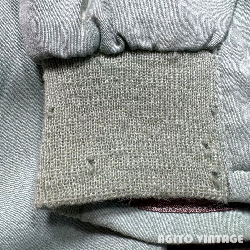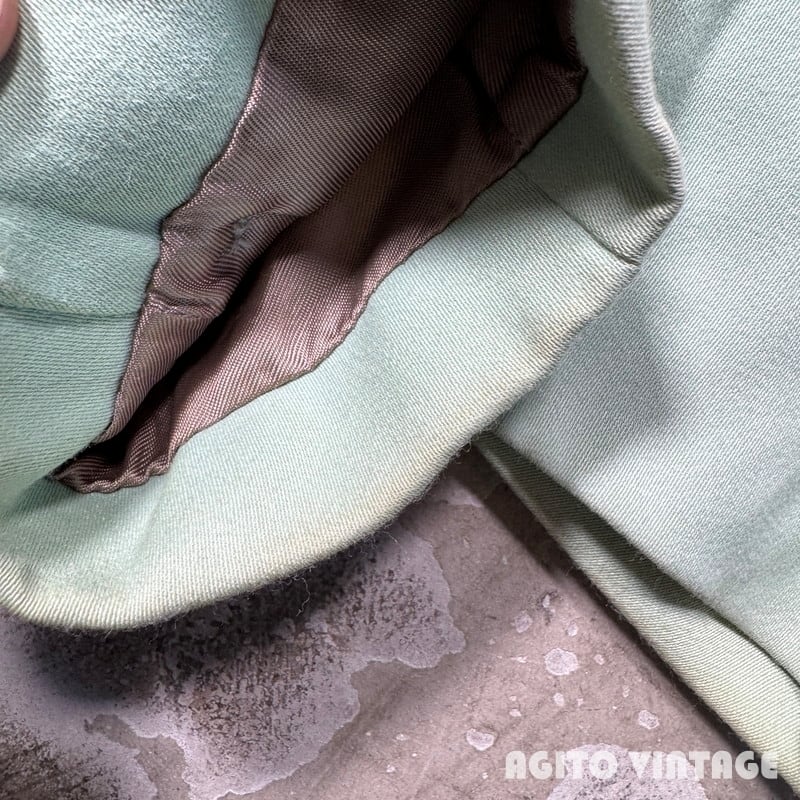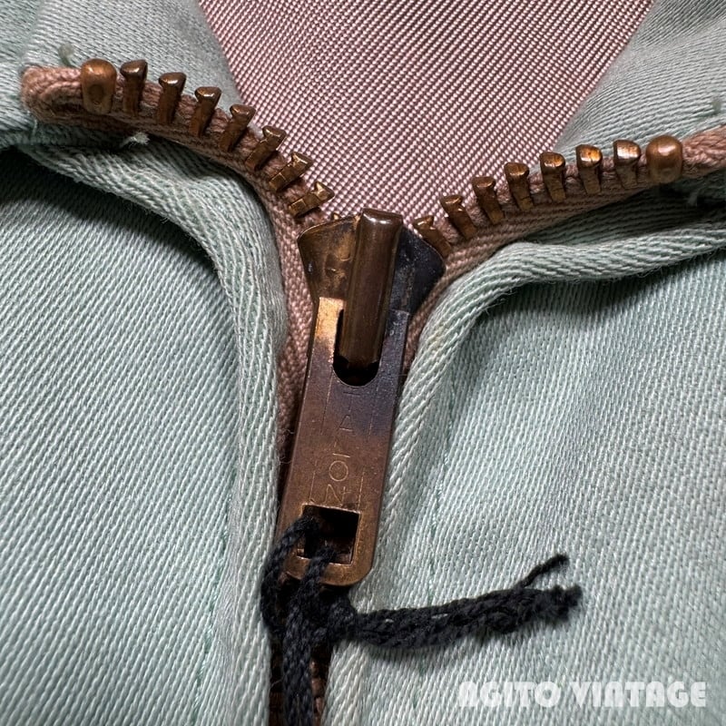 50年代頃のGUITERMAN BROS INC. TOWN&COUNTRY ギャバジンジャケットです。GUITERMAN BROSはタグに1881年とある事から140年以上前に創業したブランドのようです。ご紹介するこちらは、当時の下げ札が残る希少な1着です。レーヨンとナイロンの混紡で鮮やかなミントグリーンが目を惹きます。フロントはTALONジッパーが使用されています。右ポケット内側には紙タグがしっかりと残っています。肩にパッドが入るタイプですが薄いのでそこまで気にならないかと思います。襟や袖先に薄汚れがあり袖や肩に長期保管のヤケが見られますのでデッドストックという訳ではありませんが、コンディションの良い個体です。36表記ですのでS相当ですがジッパーを閉めなければM相当の方でも着用可能だと思います。細かな薄汚れや、リブに虫食い等見られますが、貴重な当時のタグが付くギャバジャンはかなり珍しいと思いますので、お好きな方は是非この機会をお見逃しなく。