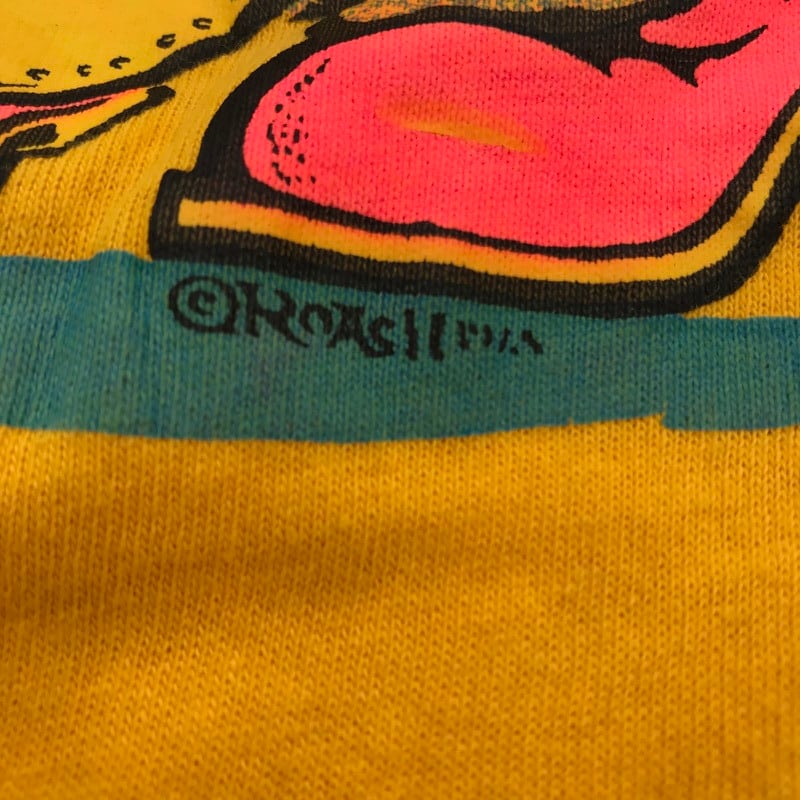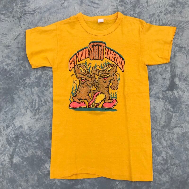 70年代頃のROACHデザインのTシャツです。GET YOUR SHIT TOGETHERとはしっかりしろ等の意味があるそうです。なかなかインパクトのあるデザインです。ROACHは70年代から80年代に活躍したグラフィックアートグループで、ラメのアイロンプリント等が有名です。右脇に小さな裂けがある以外とても綺麗です。フェスやイベントで映える1着です。サイズはXSからSくらいで小さめです。