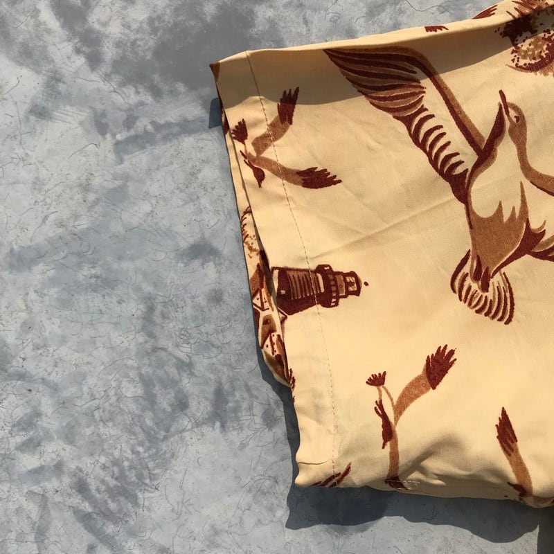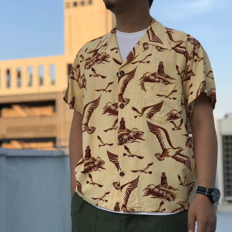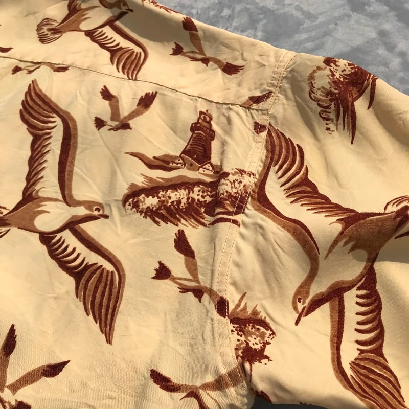 40年代から50年代頃のバックパネルで有名なCatalina カタリナのレーヨンハワイアンシャツです。あまり見かけない、トビウオタグが珍しい1着です。しっかりとしたレーヨンボディに、全面海鳥と灯台がハンドプリントで描かれています。所々にうっすらと汚れはございますが、フロントに1箇所リペアがございますが、比較的美品と思われます。人と被りにくいデザインですので、おススメです。