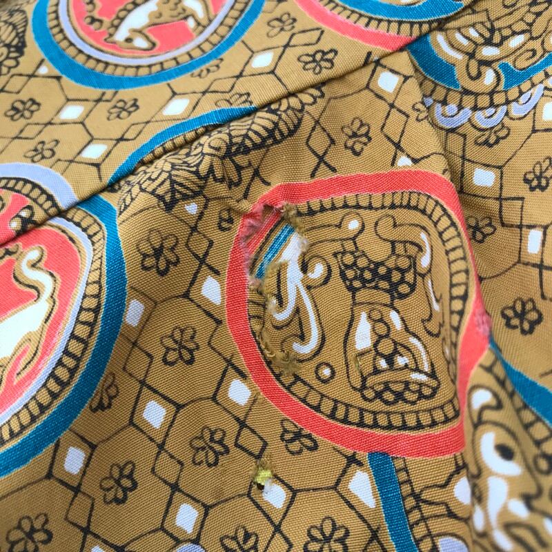 50年代頃のDUKE KAHANAMOKU デュークカハナモクの長袖ハワイアンシャツです。レーヨンボディに総柄でハンドプリントされたオールオーバーパターンです。動物モチーフのコインのような柄と植物が描かれている珍しいデザインです。人気のCISCO社製で、長袖ハワイアンシャツはなかなか見かけないレアなアイテムです。背面に1箇所リペアがあります。サイズもMですので一番着やすいのではないでしょうか?コレクター必見です。