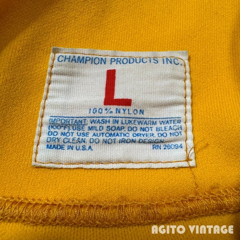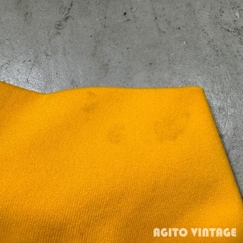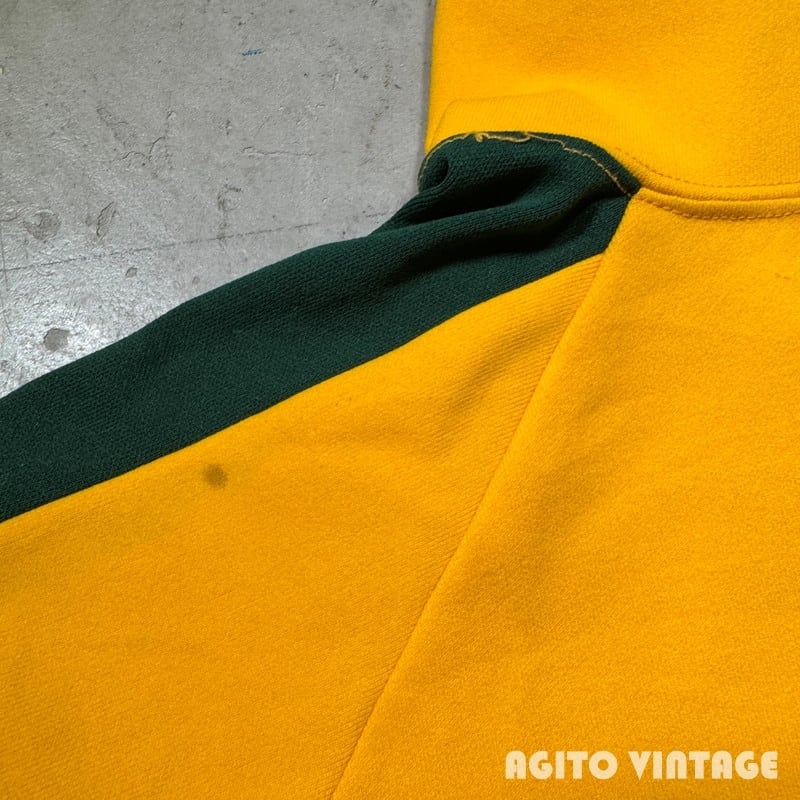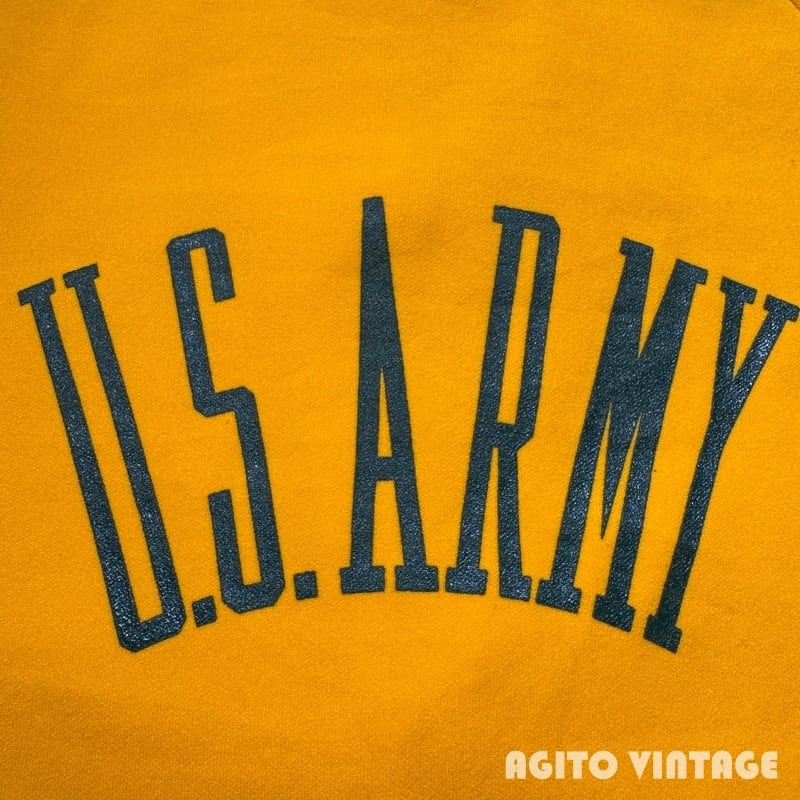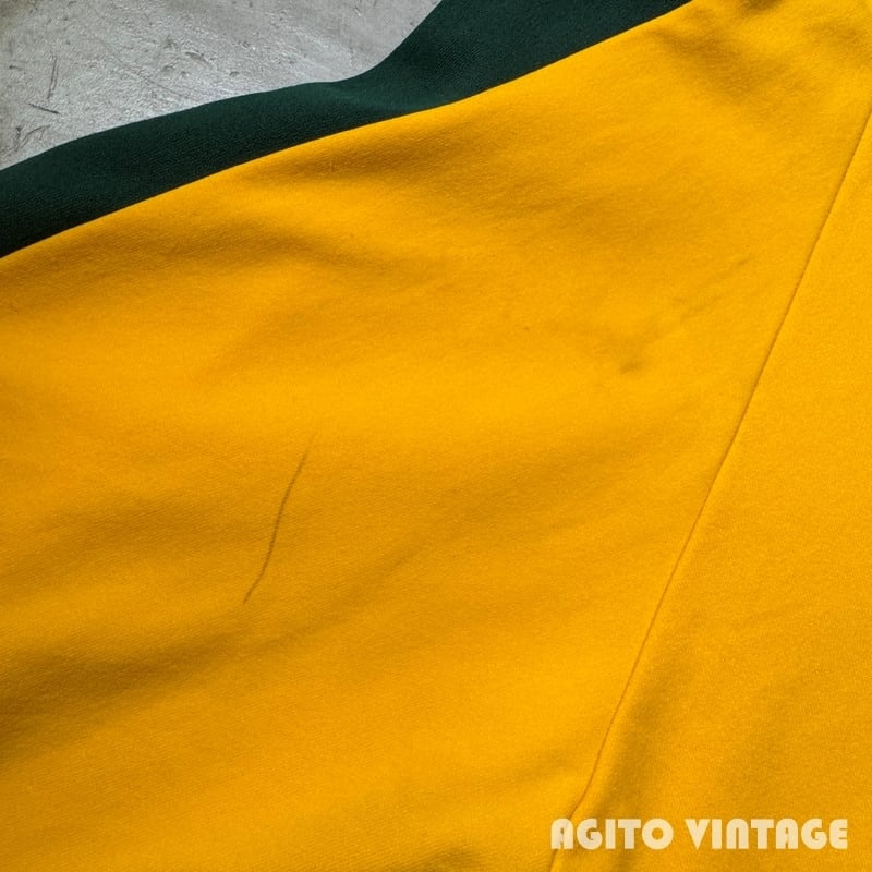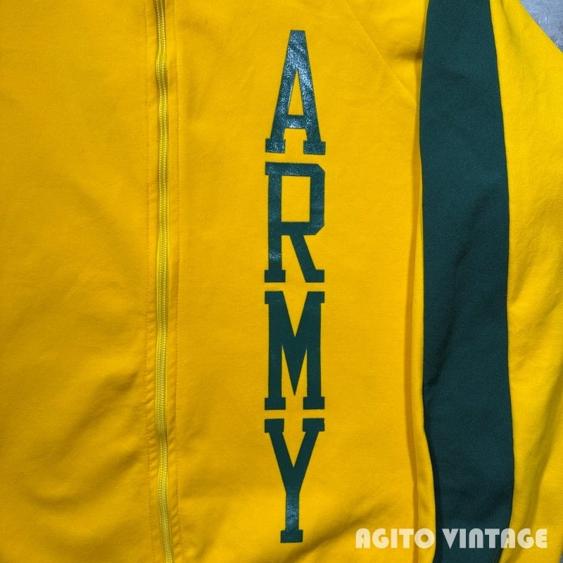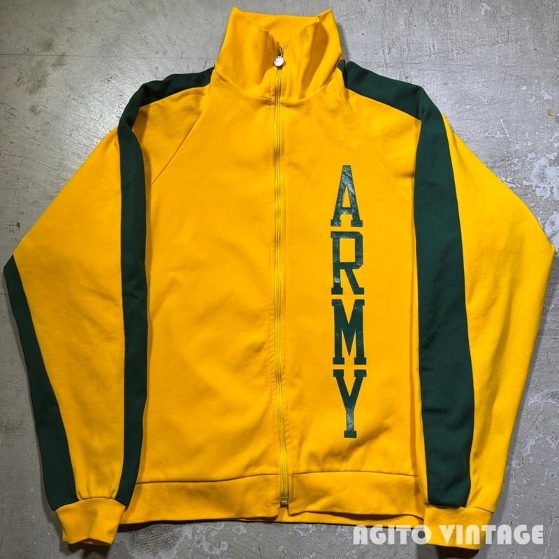 70年代頃のChampionジップアップトラックジャケットです。プロダクツ表記のタタキタグが縫い付けられています。フロントはROBINジッパーが使用され、オリジナルでChampionのボタンが取り付けられています。ポケットは付かない仕様です。イエロー×グリーンの目を惹くカラーリングで、U.S.ARMYのラバープリントが両面に入ります。陸軍士官学校などで使用されていたのでしょうか。袖や立ち襟などに汚れが見らえますがダメージは特にございません。