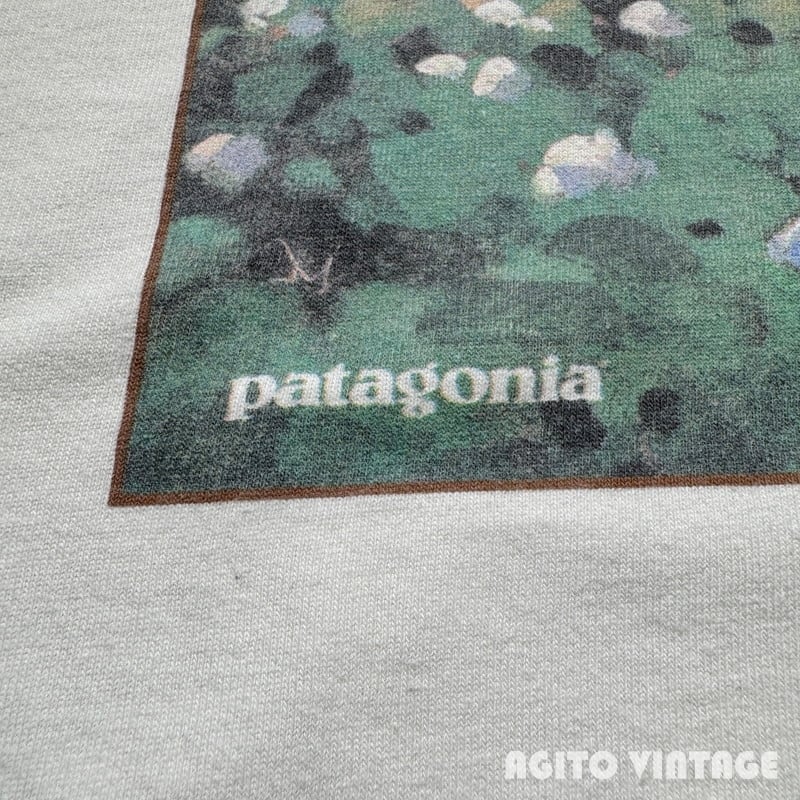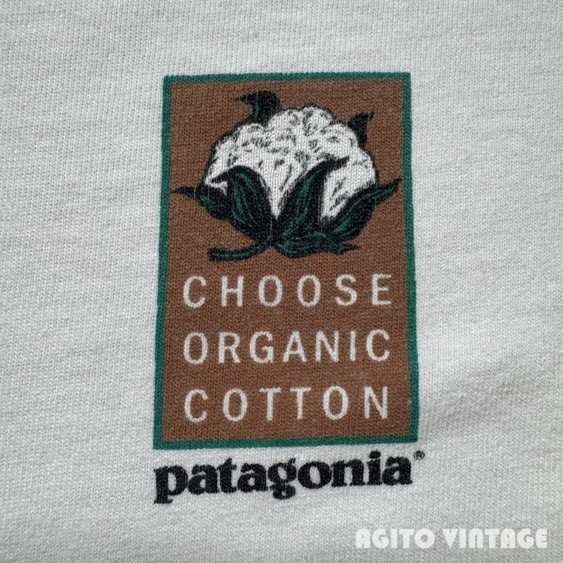 90年代のpatagonia ファーマープリントTeeです。patagoniaは1996年からオーガニックコットンの使用を開始し始めました。今回ご紹介するこちらは1996年に販売されていた初期のモデルです。胸元にはCHOOSE ORGANIC COTTONのロゴと背面には同文字とGregory Manchess氏が描いた綿を収穫しているファーマーのイラストがプリントされています。袖、裾共にダブルステッチです。襟元や腹部に薄汚れがございます。ダメージは無くコンディションは良好かと思います。XL表記で、ゆったりとしたサイズ感です。古いパタゴニアのTシャツはお探しの方も多いと思いますのでこの機会に是非いかがでしょうか。