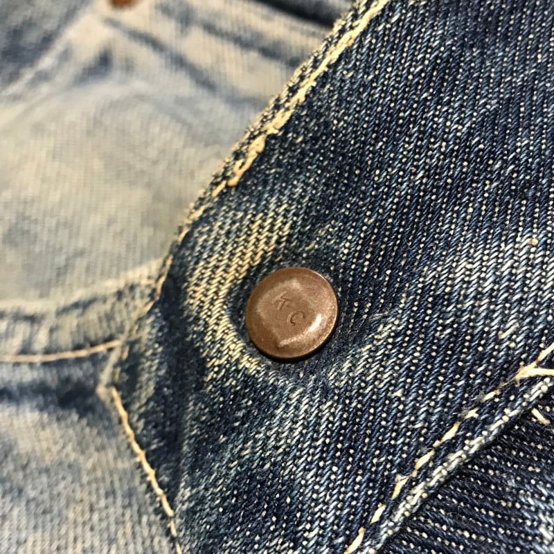 50年代後期から60年代初頭頃のLee RIDERS 101B サイド黒タグモデルです。センター赤タグからサイド黒タグに移行した初期のものは、SANFORIZEDの文字の下に、MADE IN USAが表記されますが、こちらはその表記が無い為、初期タグの次のモデルと推測されます。バックポケットのピスマークは擦れていますが、Rマークが入りで間違いなさそうです。バックポケット裏は当て布とユニオンチケットがかすかに残っています。両足前面にリペアがあり、裾はカットオフされています。背面にリペアはございません。雰囲気の良い色落ちですので、これからの季節にラフに合わせていただけます。状態特価です。