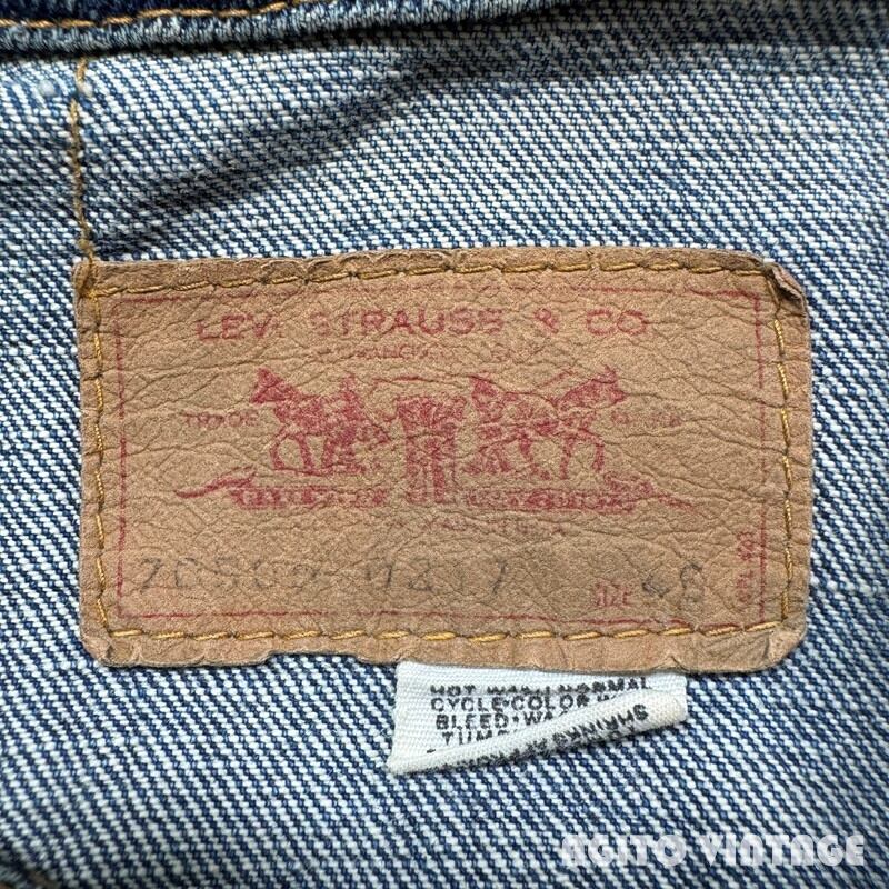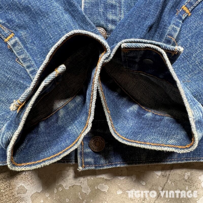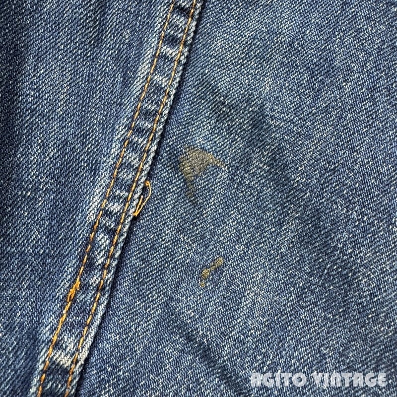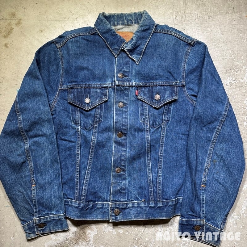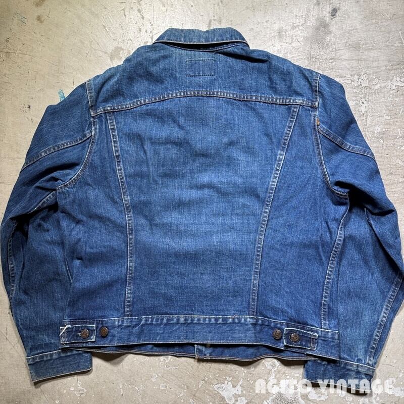 70年代頃のLevi's 70505-0217 デニムトラッカージャケットです。スモールeタブが付く4thモデルです。ボタン裏は529刻印です。布ケアタグが付くBig Eから移行したあたりのモデルだと思われます。色残りは5割程で襟や袖先にやや擦れが見られます。左肘付近にペンキの様な汚れが見られます。その他酷いダメージ等は無くコンディションは良好かと思います。印字が少し消えかかっておりますが46表記の希少なビッグサイズです。これからのエイジングも充分楽しめる色味なので大き目サイズをお探しだった方は是非この機会にいかがでしょうか。