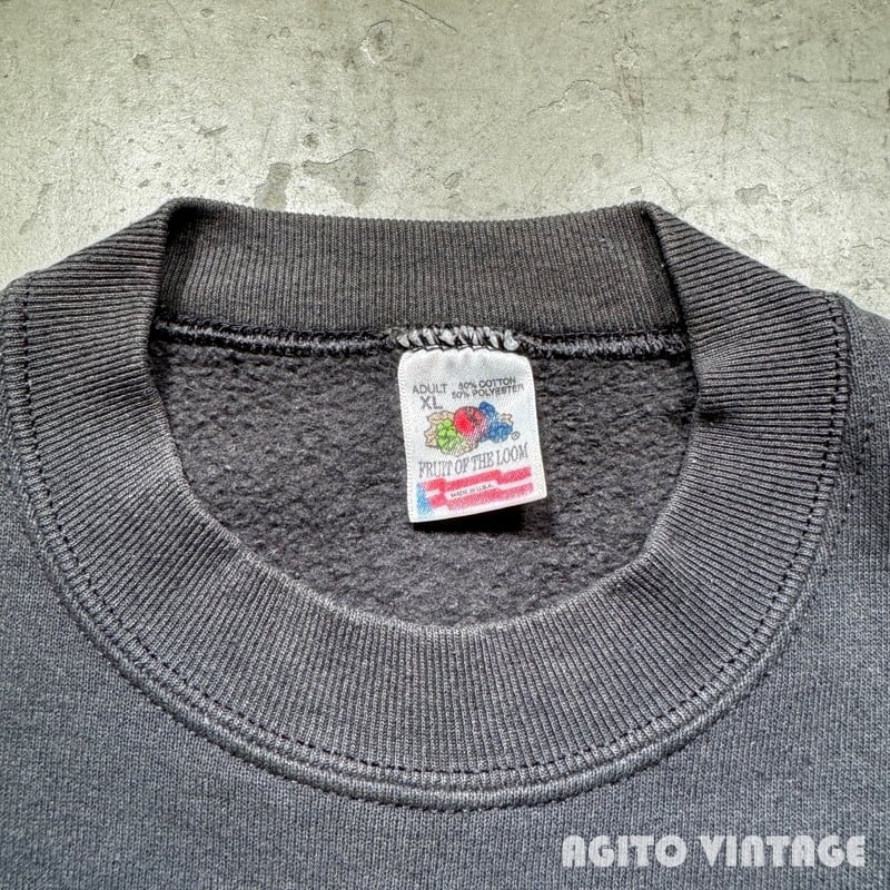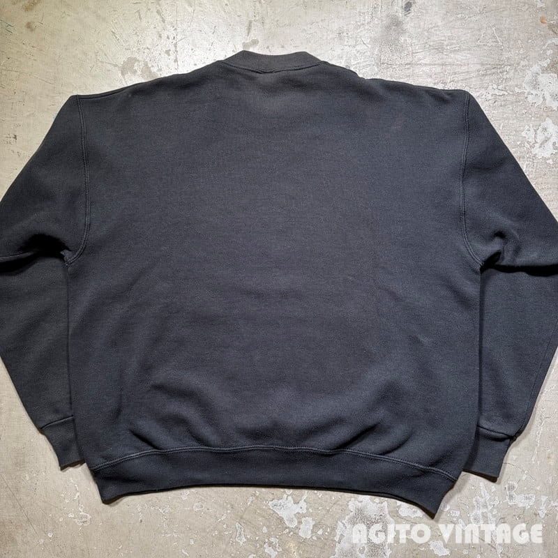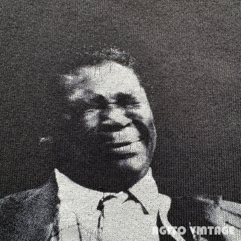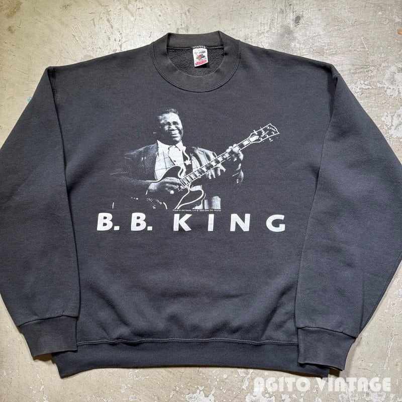 90年代のB.B.KING フォトプリントスウェットです。ボディはUSA製のFRUIT OF THE LOOMです。B.B.KING(1925-2015)は”キング・オブ・ブルース”と称されるシンガーソングライター/ギタリストで知られるミュージシャンです。「The Thrill Is Gone」や「Lucille」などが有名で数多くのアーティストに影響を及ぼした功績は今もなお語り続けられています。ご紹介するこちらはB.B.KINGがギターを演奏しているフォトプリントが施された1着です。1993年のコピーライトが入ります。若干の色褪せがあり背面右肩付近にうっすらと変色がございますが目立つ汚れやダメージ無いグッドコンディションと言える個体です。XLサイズでゆったりと着用していただけます。このフォトプリントのTシャツはたまに見かけますがスウェットは初見でした。B.B.KINGファンはもちろんブルースがお好きな方も是非この機会にいかがでしょうか。なかなか出会わないアイテムだと思います。