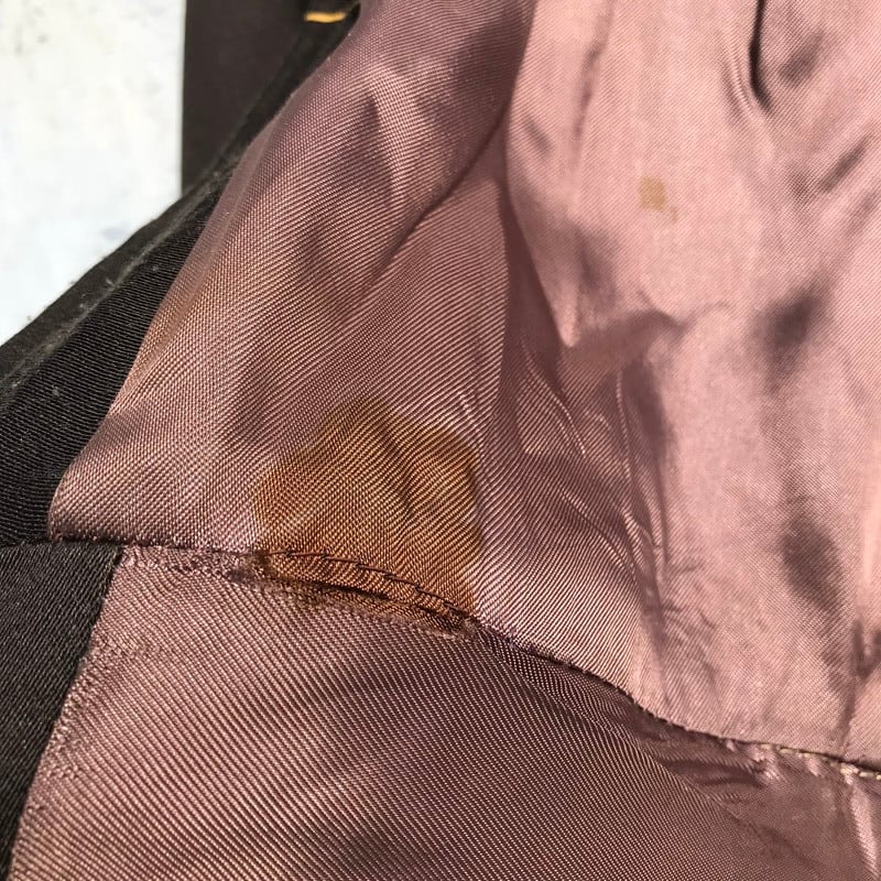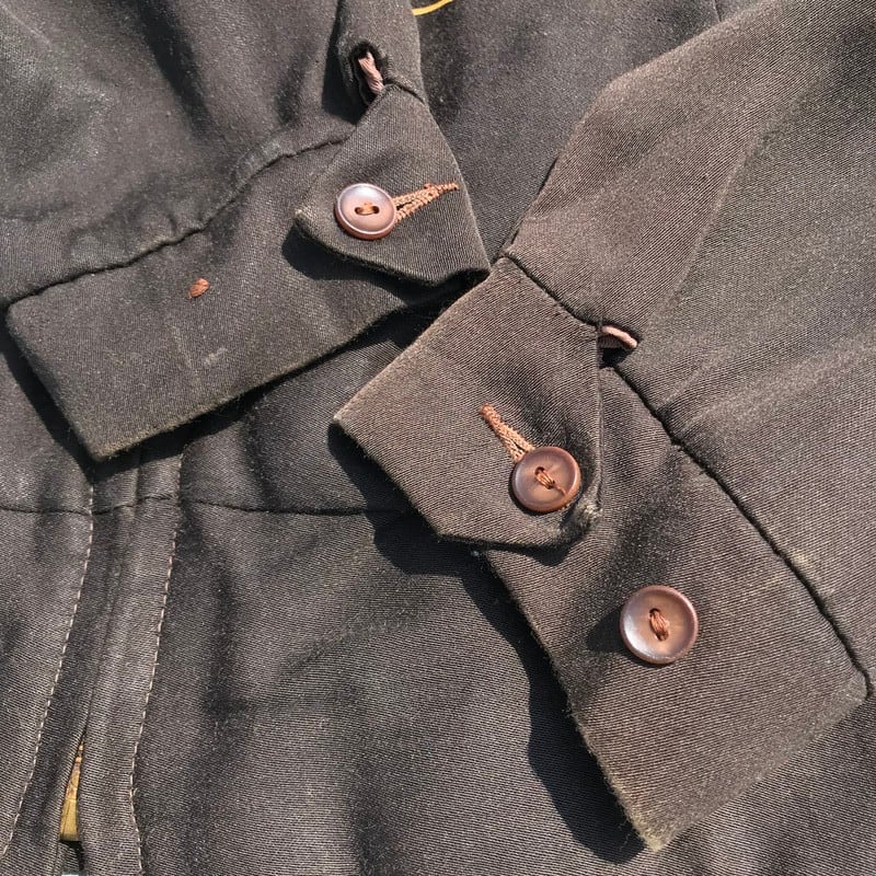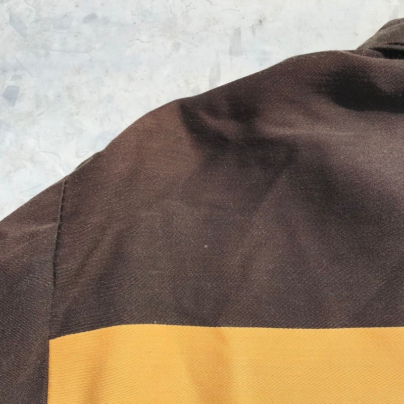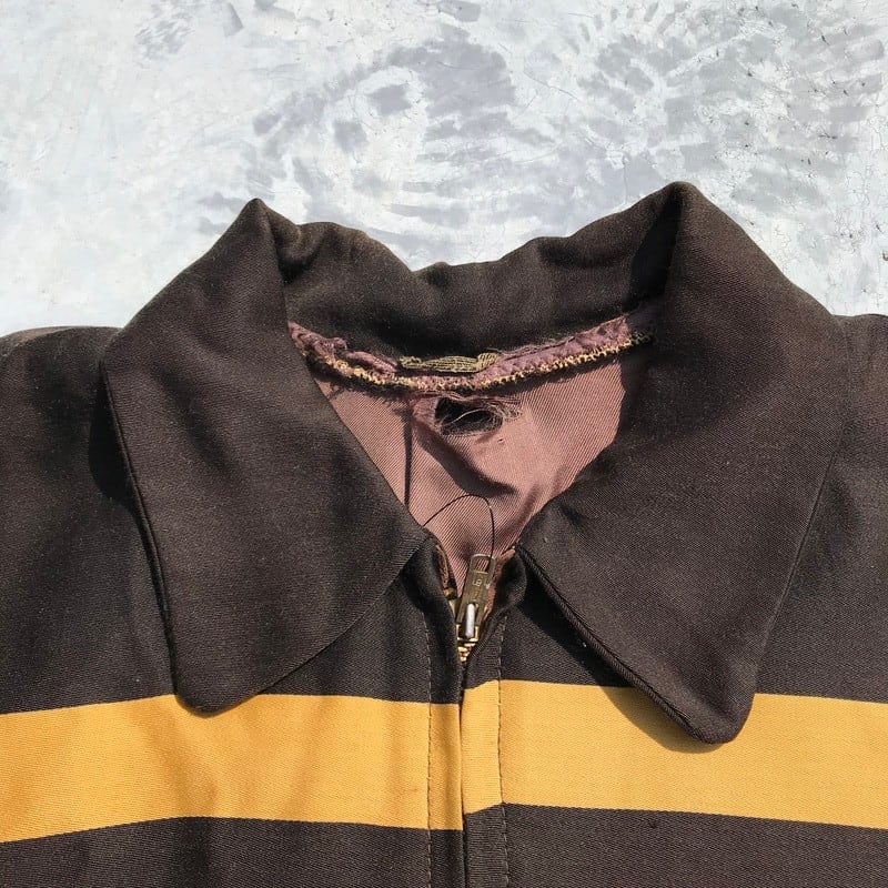 50年から60年代頃のギャバジンジャケット通称ギャバジャンです。ブラウンのボディに、イエローのラインが入る珍しい2トーンです。TALONジッパー採用。裏地の首元あたりと袖口にダメージがございます。右肩にナイロン製の糸で縫い直された箇所がございます。表面的には比較的美品かと思われます。右袖口のボタンがいこ欠損しております。サイズはS相当ですので、男性のみならず女性も合わせやすいです。50年代頃のロカビリーファッションなどがお好きな方必見です。