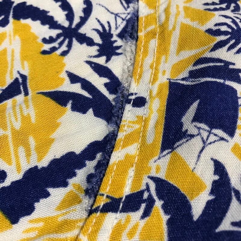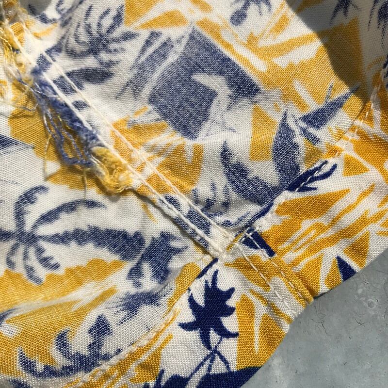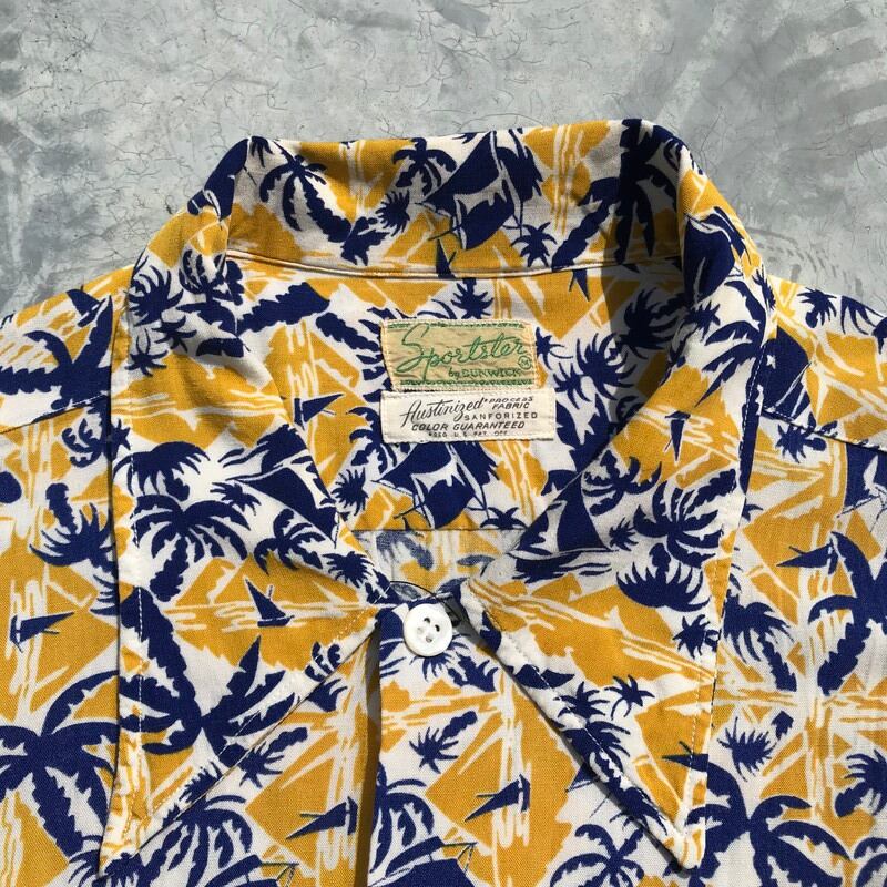 50年代から60年代頃の物と思われる、Sportsterコットンレーヨンシャツです。アロハシャツのようなパームツリーやヨットの総柄となっており、柔らかい生地感です。特筆する汚れはございませんが、左右袖の袖の根元のステッチがずれてほつけたようになっていますので、リサイズもしくは袖の付直しを施されているかもしれません。左袖の元が縫い直しの為か生地が薄くなっています。これからの季節に使いやすい生地感ですので、アロハシャツ等がお好きな方におすすめです。