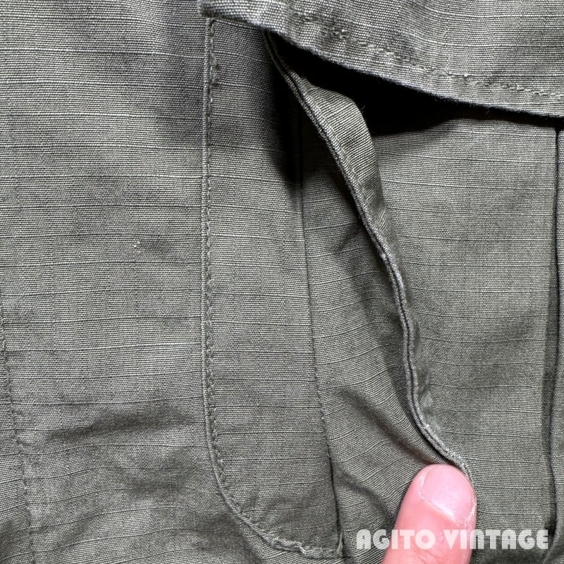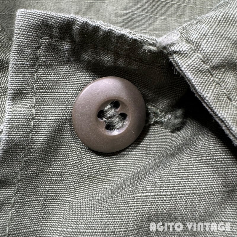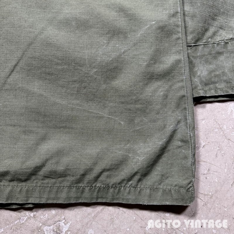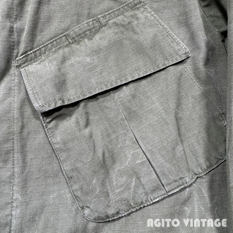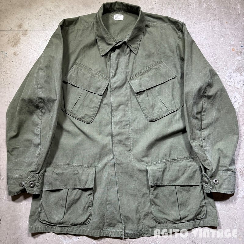60年代のU.S.ARMYジャングルファティーグジャケットです。リップストップの4thモデルです。DSA100-68-C-0831、コントラクターはRICHARD WYNN ENTERPRISES,INC.です。BDUボタンにリップストップ、ポケット下部にはドレンホールあり。袖先の逆V字のマチがつきます。左下部ポケット以外のマチと右袖のマチは色味が違う生地が使用されています。全体的に擦れや色褪せがあり、肩や袖等に白っぽい擦れのような汚れが見られます。ダメージは特にございません。MEDIUM REGULAR表記です。着丈が少しあるのでハーフコートっぽい感覚で合わせても良いかもしれません。1枚あると何かと合わせやすいのでお持ちで無い方は是非この機会にいかがでしょうか。