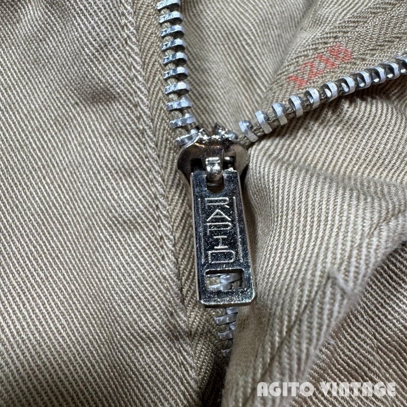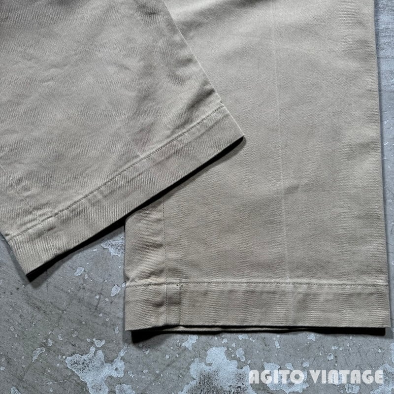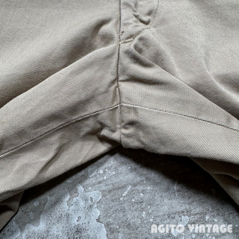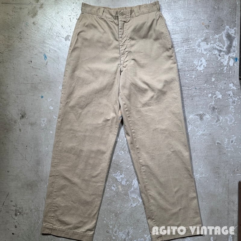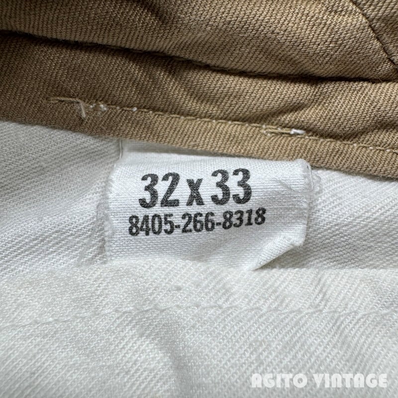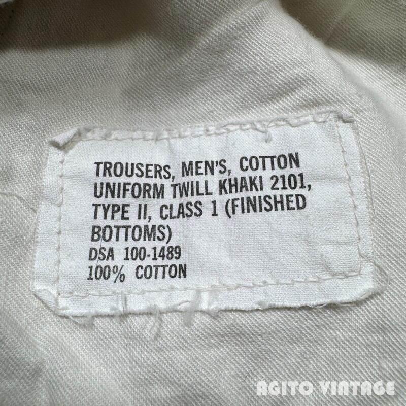 60年代のUSMCチノトラウザーズです。DSA100-1489、コントラクターは不明です。バックポケットにフラップが付くタイプで、小ぶりな尿素ボタンにアルミのRAPIDジッパーが使用されています。ミリタリーのチノパンらしくゆったりとしたワタリ幅でワイドなシルエットです。細かな擦れや薄汚れはございますが目立つ汚れやダメージは特に無くコンディションは良好です。ウエストの表記はW32ですが実寸はやや縮みが入りW30インチです。レングスもしっかりとございますので身長の高い方でも合わせていただけると思います。ワイドシルエットのミリタリーチノをお探しだった方は是非いかがでしょうか。生地もしっかりとしていますので長くご愛用頂けます。