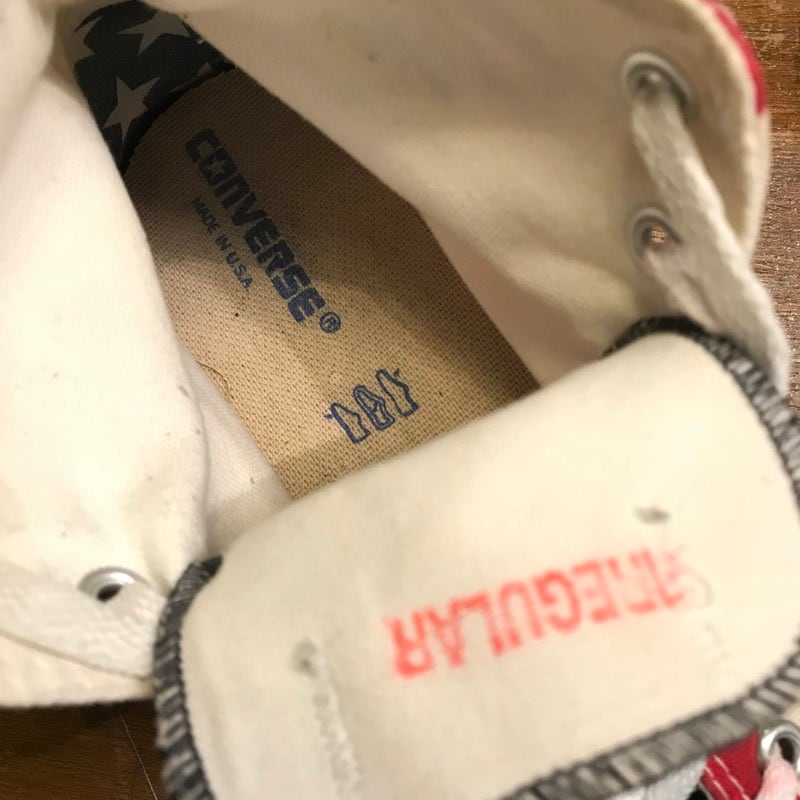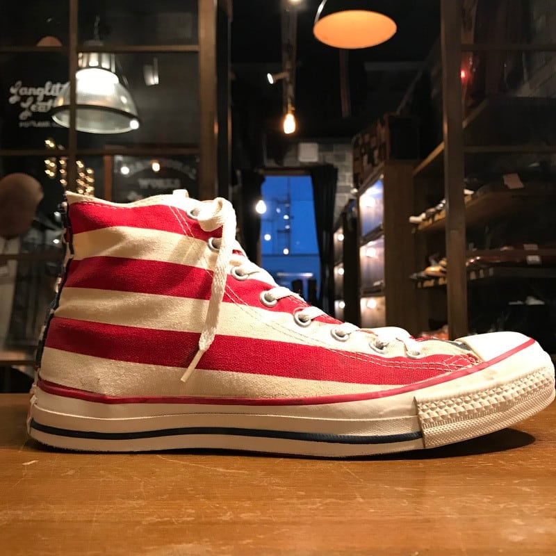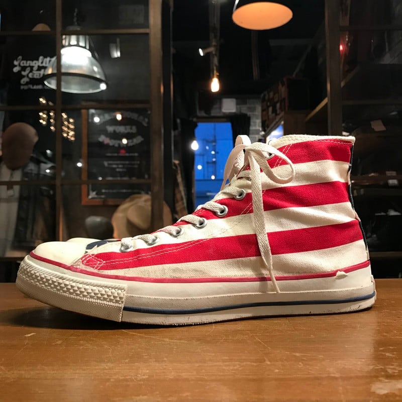 90年代のCONVERSE ALL STAR HI です。90年の後期頃のモデルで、星条旗柄が眼を惹く1足です。ソール減りも少ないですが、アッパーなどに薄汚れはございます。トゥが少しだけ硬くなっており細かいヒビの様なものが見られますが、着用に支障はなさそうです。こちらもUS11と大き目ですが、普段27.5位のスニーカーを履いてるスタッフが大き目にデカ履き出来ていますオーバーオールなどのゆったり目のボトムと相性が良さそうです。USA製コンバースは年々価格も高騰傾向ですので、お探しだった方はこの機会に是非。