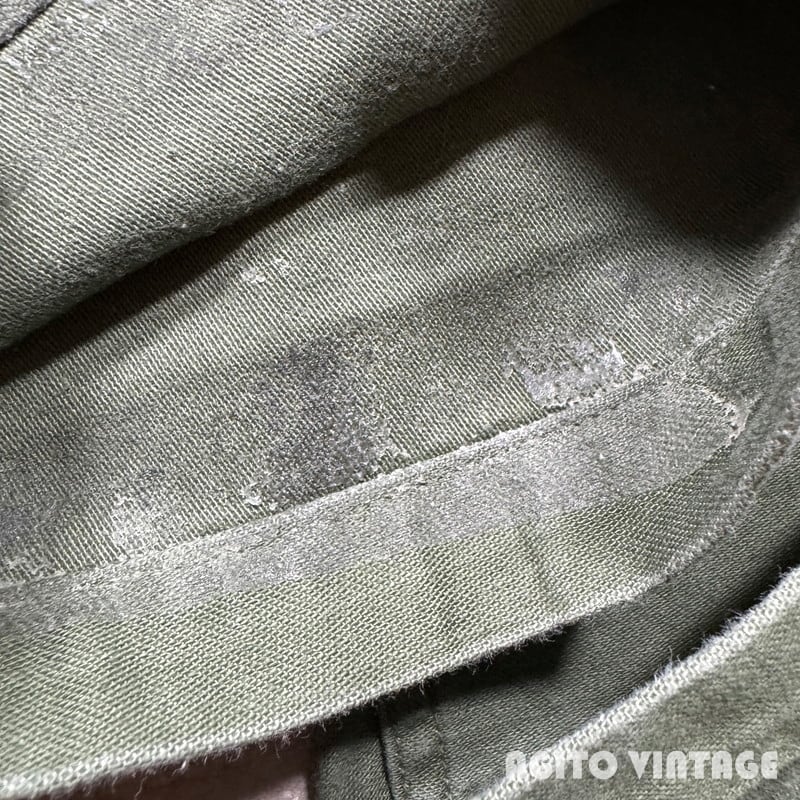 60年代のU.S.ARMY OG107ベイカーパンツです。DSA-1-4067-64-C、コントラクターは不明です。ミリタリートラウザーズの中ではフィールドパンツと並び定番とされるベイカーパンツで、こちらはウエストサイドにアジャスターが付くモデルです。ボタンは後年のUFO型では無く艶のあるタイプが使用されています。ウエスト両サイドにはアジャスターが付きます。脛辺りに内側へロールアップされていたと思われる擦れの跡が見られます。裾内側にロールアップの仮止めの際にテープで留めていた形跡があり汚れています。その他全体的に細かな擦れや毛羽立ち等ございますが、生地もしっかりとしておりコンディションは良好です。ウエストはW34インチで需要の高いサイズだと思います。ここ数年で古いベイカーパンツを見かける機会も少なくなった印象です。サイズがバッチりな方は是非この機会をお見逃しなく。ベイカーパンツは何本持っていても飽きずに使える優秀なアイテムですのでオススメです。