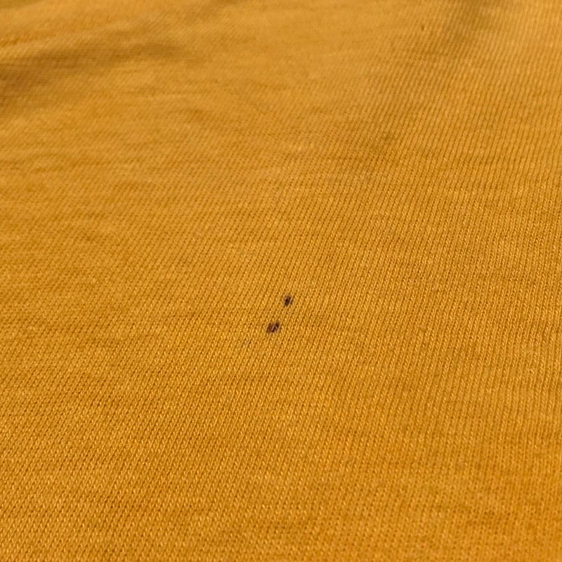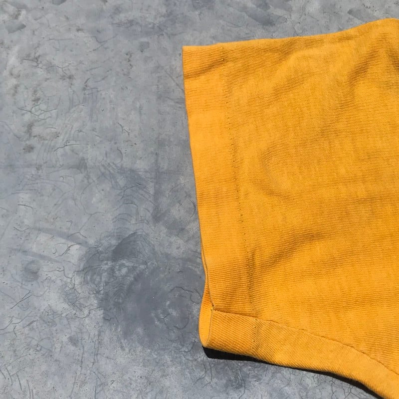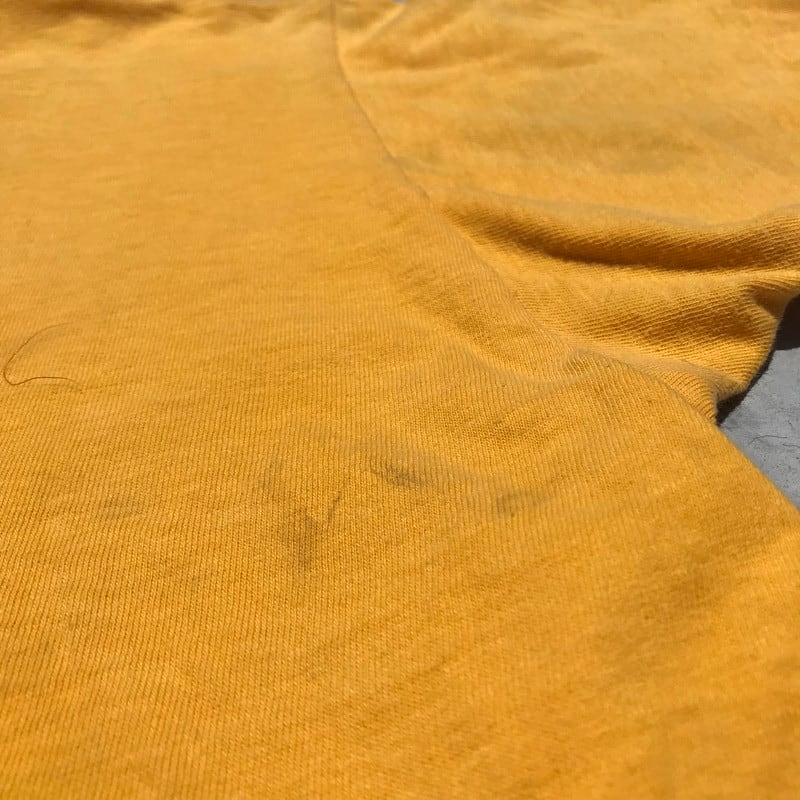 袖や裾はシングルステッチです。味のある染み込みプリントが目を惹く1着です。所々に薄汚れがございますが、使用感以外のダメージは無く状態は良好です。ベイカーパンツ等との相性が良さそうです。表記LARGEですが、着丈が短めとなっています。