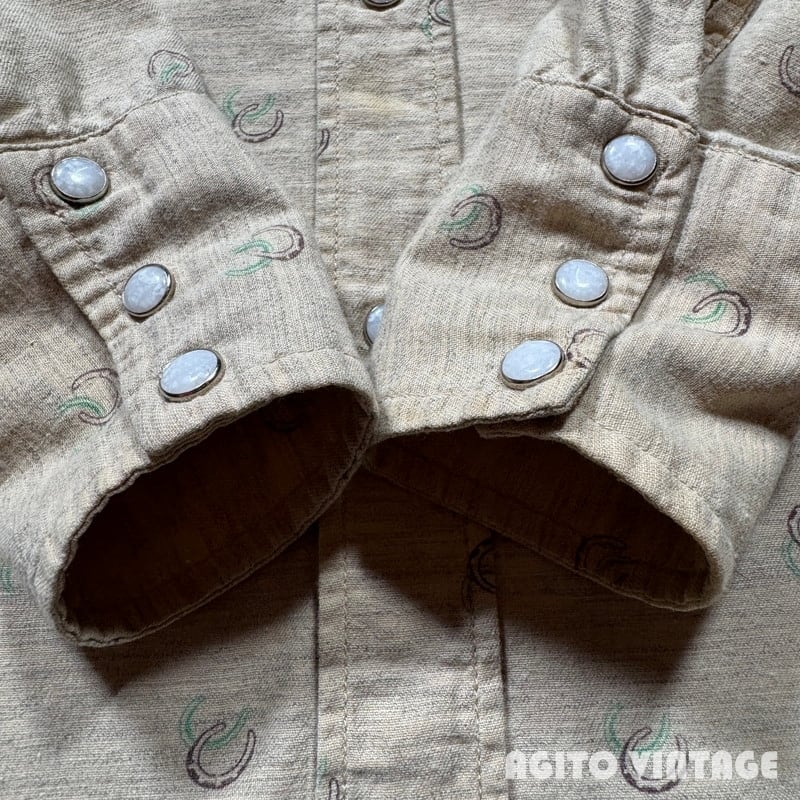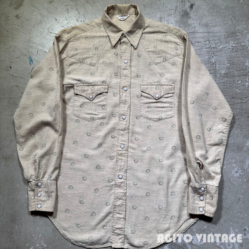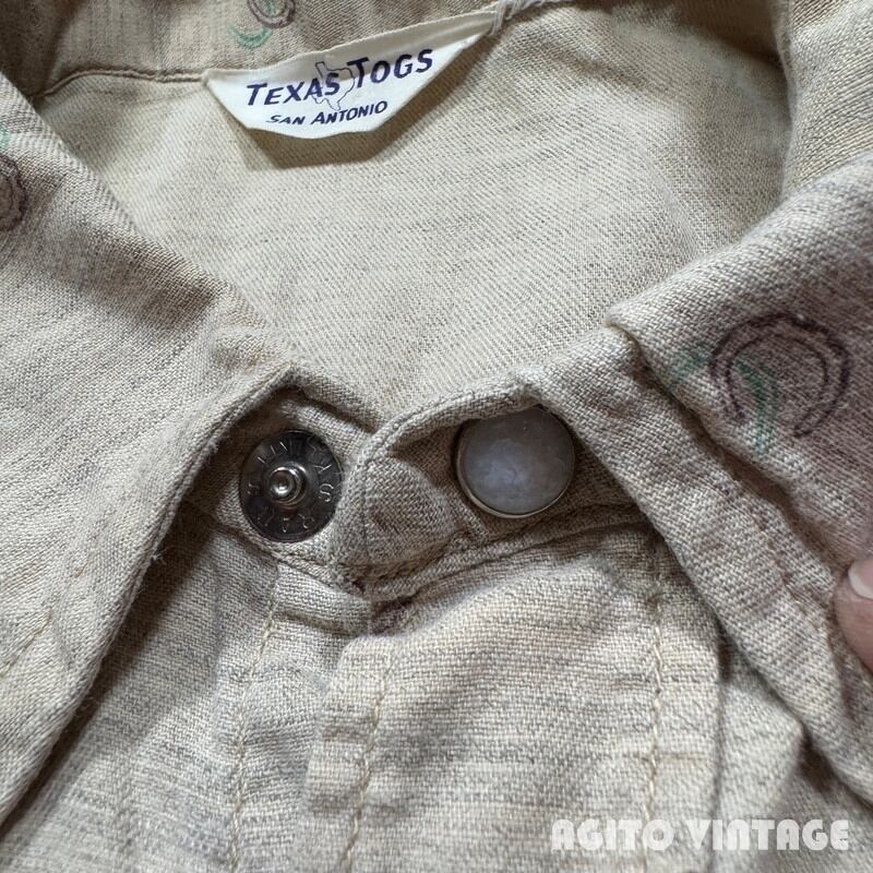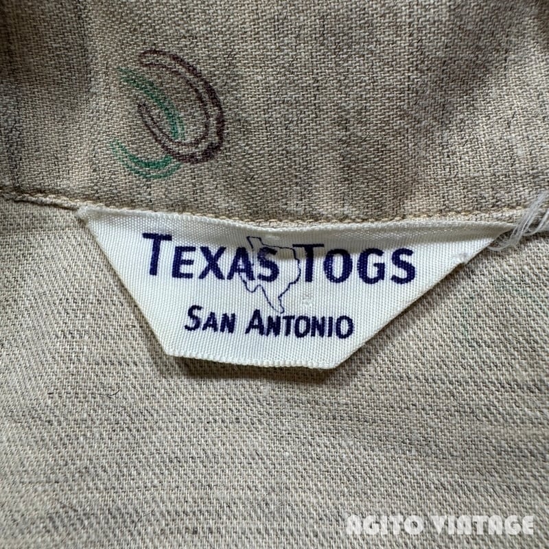 50年代頃のTEXAS TOGS プリントコットンウェスタンシャツです。ブランド詳細は不明ですがタグに記載がある通りテキサス州サンアントニオで創業した衣料品メーカーだと思われます。三角のプリント吊りタグが付き、襟はシングルステッチでボタンはトップまでフルスナップボタンです。ベージュとイエローの間の様な生地に馬蹄と絣柄がプリントされています。襟やフロントな肩などいくつかうっすらとした汚れはございますが、ダメージは特に無くコンディションは良好かと思います。表記はございませんが身幅のサイズからS相当かと思われます。絣調のプリントもこの年代らしい特徴かと思います。古いウェスタンシャツをお探しだった方は是非いかがでしょうか。
