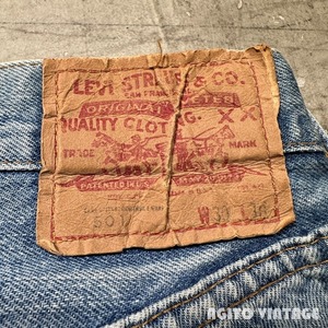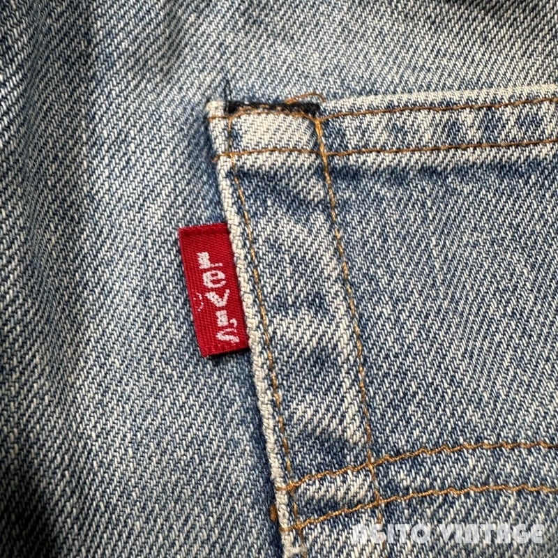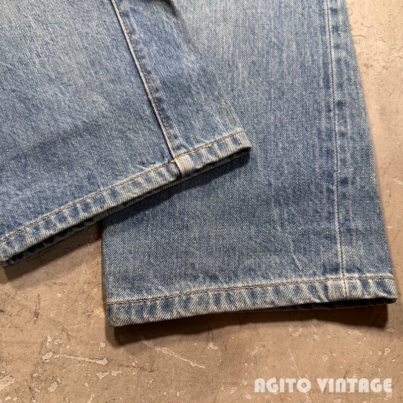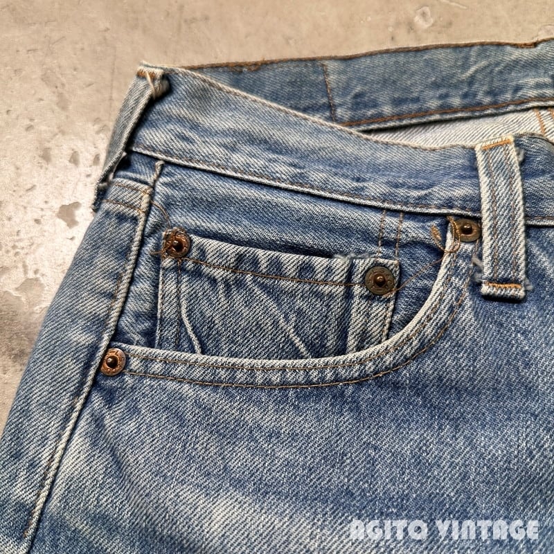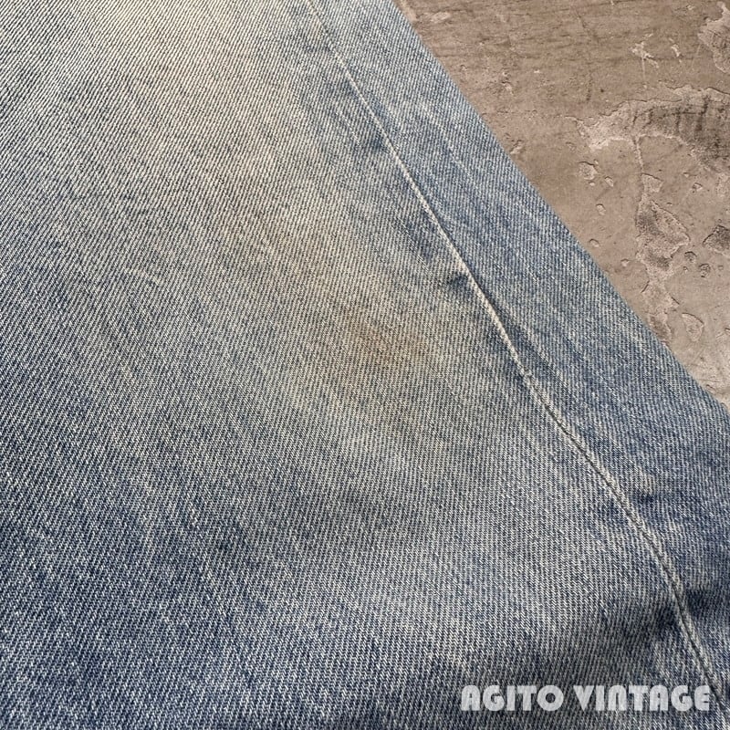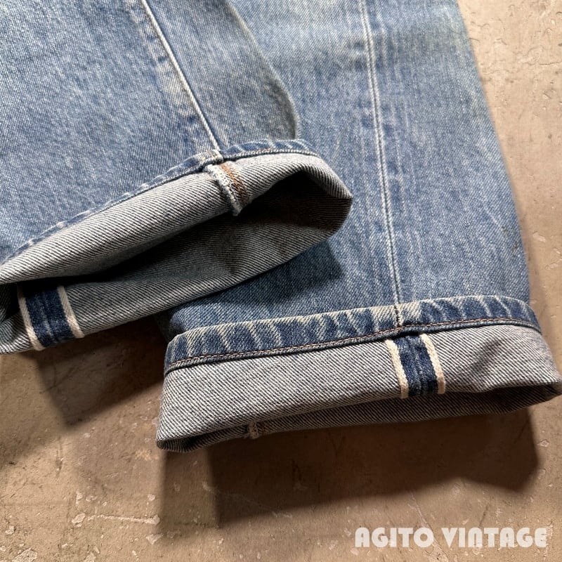 80年代のLevi's 501 デニムパンツです。ボタン裏刻印524、赤タブスモールe、バックポケット裏チェーン、アウトシームセルヴィッジ。内タグがナイロンっぽい素材で、文字がかなり薄れていますが小さな文字で説明が書かれているようで当時ヨーロッパへの輸出用に販売されていた物と思われます。色残りは2~3割程でうっすらとヒゲが入ります。レングスはシングルステッチで裾上げがされています。2番めのボタンホールが若干緩めです。その他細かな擦れ等はございますが、リペア等無くコンディションは良好です。表記はW30ですが実寸はW27インチ位です。ウエストサイズはやや小さめではありますがレングスは充分長さがございます。気兼ねなく穿けるセルヴィッジデニムをお探しだった方は是非この機会にいかがでしょうか。