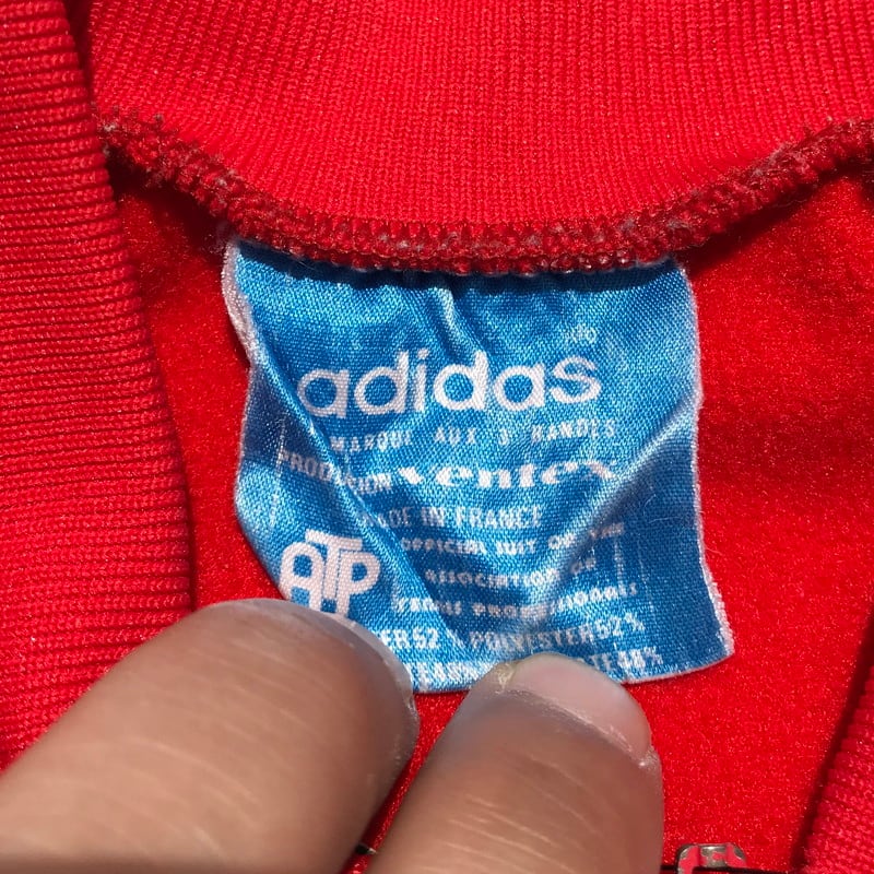 70年代から80年代頃のadidas ATP トラックジャージです。ATPとは、1972年に発足した男子プロテニス協会の略です。人気のレッド×ネイビーで、胸元のトレフォイルマークはネイビーで刺繍されています。希少なフランス製で、デザイン状態共にグッドな1着。汚れやダメージはございませんが、裏地が少し毛羽立っています。サイズ表記はございませんが、メンズのMからLサイズ相当です。