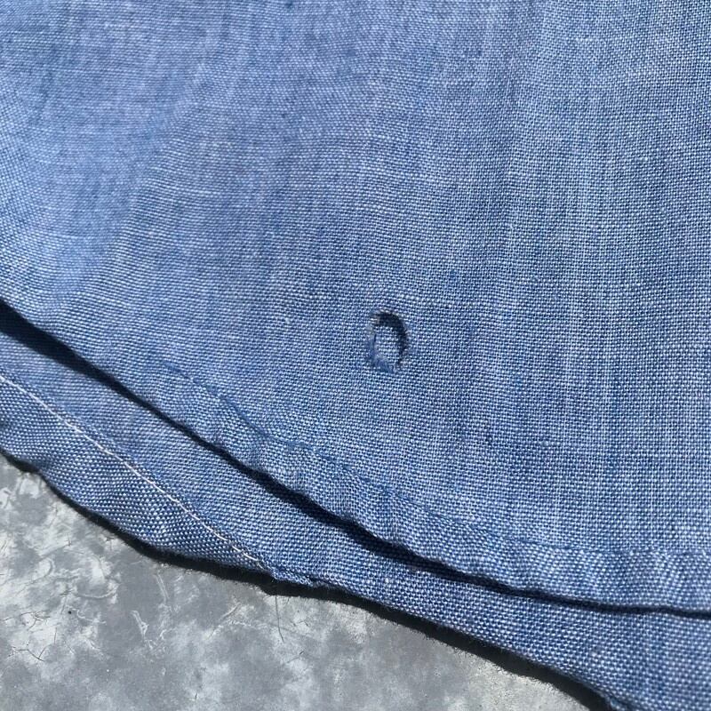 60年代から70年代頃の物と思われる、ハンドペイントシャンブレーシャツです。かわいらしく味のある動物や、食べ物が手描きでペイントされた唯一無二の1着です。着丈がリサイズされていますので、シャツ出ししても着やすくなっています。フロントの裾辺りに5mmほどの穴がございます。使用感はございますが、その他目立つ汚れなどはございません。Sサイズ位ですので、女性の方にもおススメです。