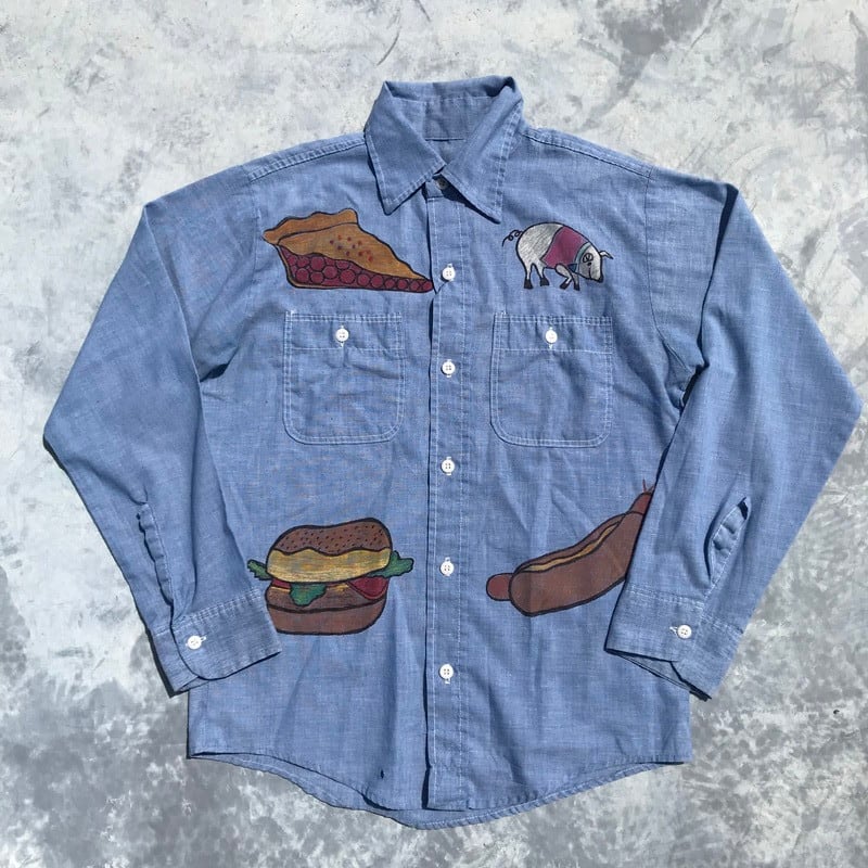 60's 70's ハンドペイント シャンブレーシャツ ハンバーガー リサイズ USA製 手描き S 希少 ヴィンテージ