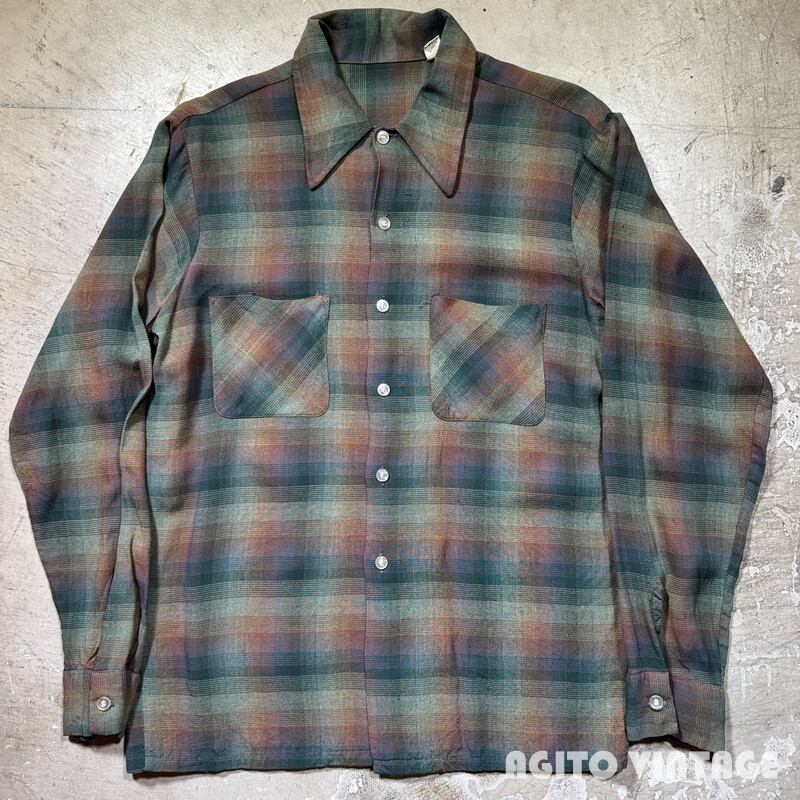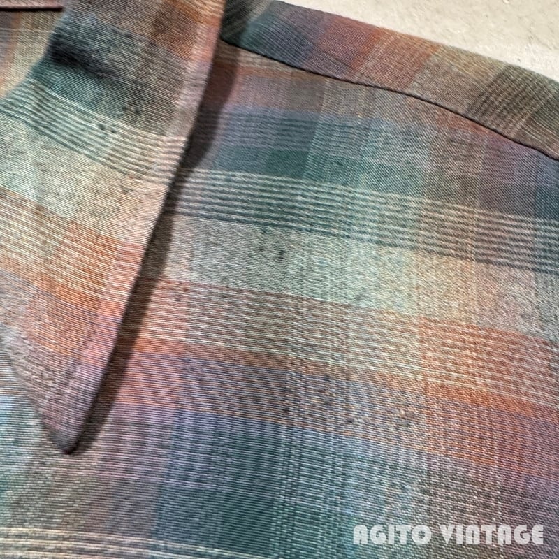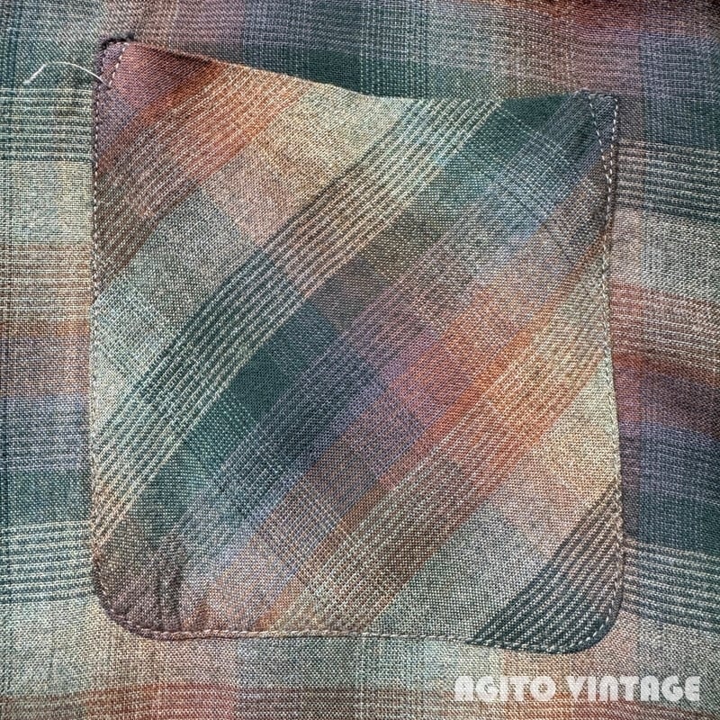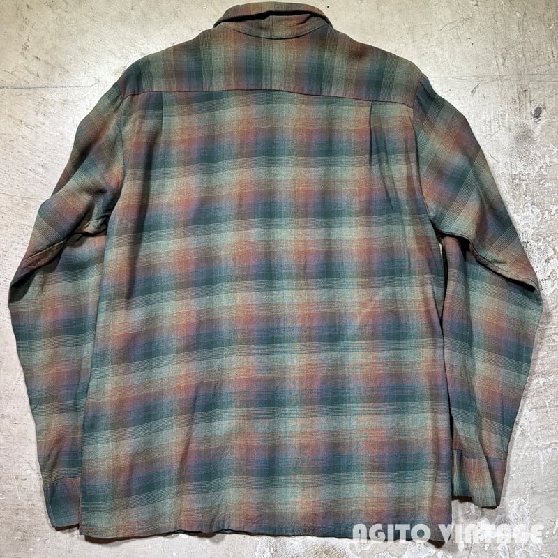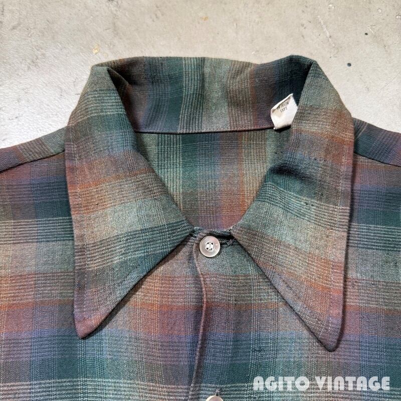 70's Unknown オンブレチェックシャツ L/S レーヨンポリエステル シャドーチェック グリーン ブラウン 高配色 グッドコンディション Mサイズ USA製 希少 ヴィンテージ BA-2869 RM3290H