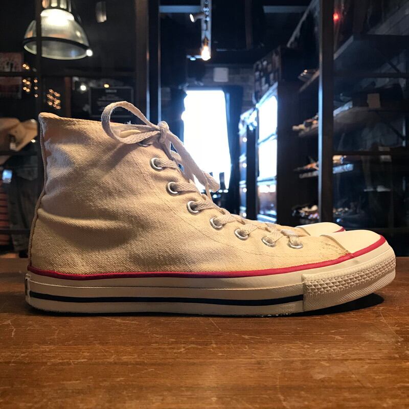 90年代のCONVERSEオールスターハイです。インソールの印字に注意事項マークの入る90年代後期のモデルです。オフホワイトのコンバースはは様々なファッションシーンで愛されている永遠の定番と言っても過言ではございません。全体に使用感や薄ら汚れはございますが、ソール減りも少なく美品です。