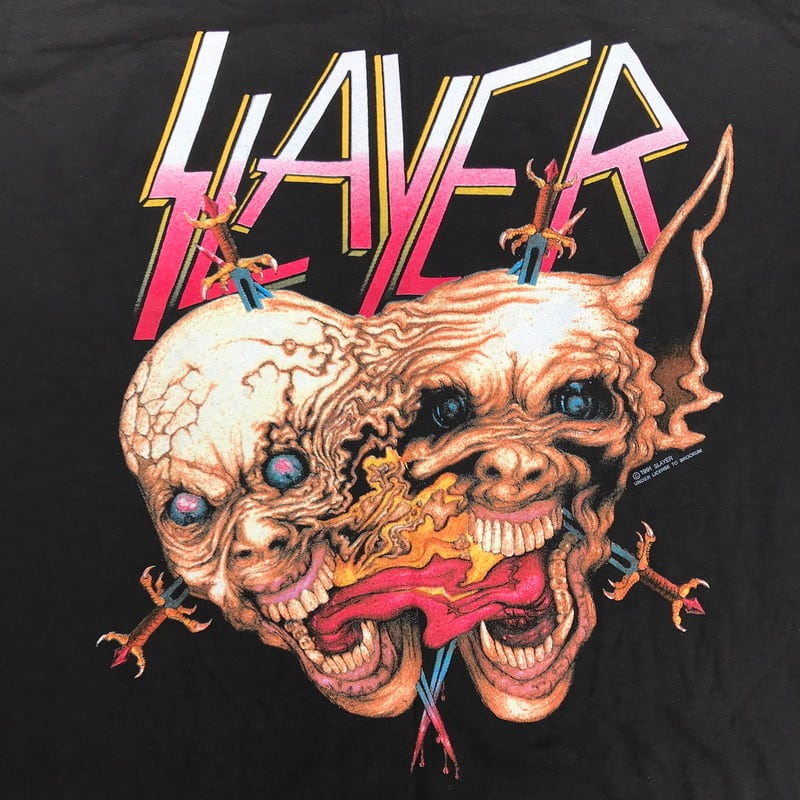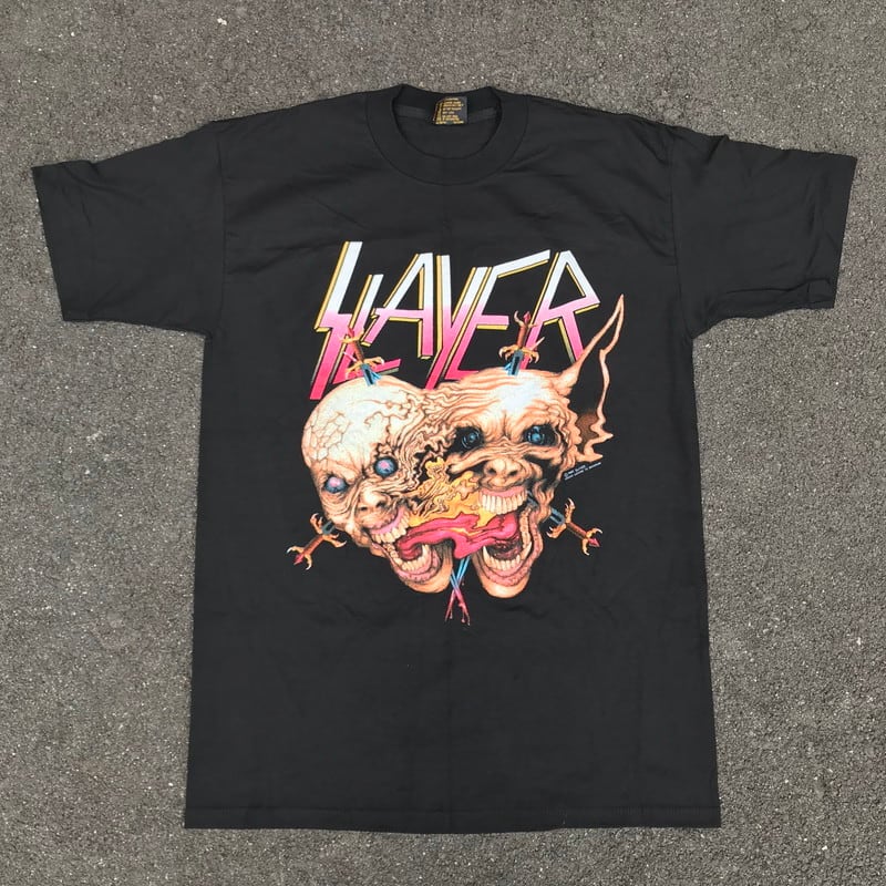 90年代のSLAYERツアーTシャツです。1991年に行われたCLASH OF THE TITANS TOURのTシャツで、未使用のデッドストックです。ボディはコットン100%でBROCKUM社、USA製です。メタリカ等と並びスラッシュメタルBig4として有名なバンドです。80s、90sのTシャツは中古でも相場は上がっていますが、こちらは希少なデッドストックですので、さらに価値も高騰されると思います。サイズもLサイズで申し分無しですので、SLAYERファンや、バンドTシャツのコレクター必見アイテムです。