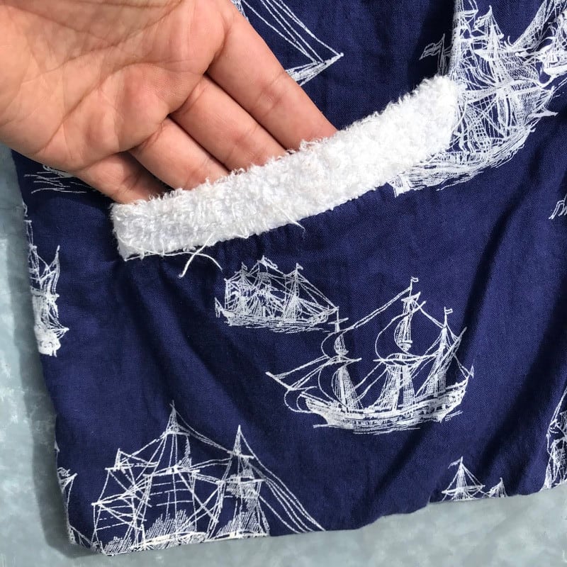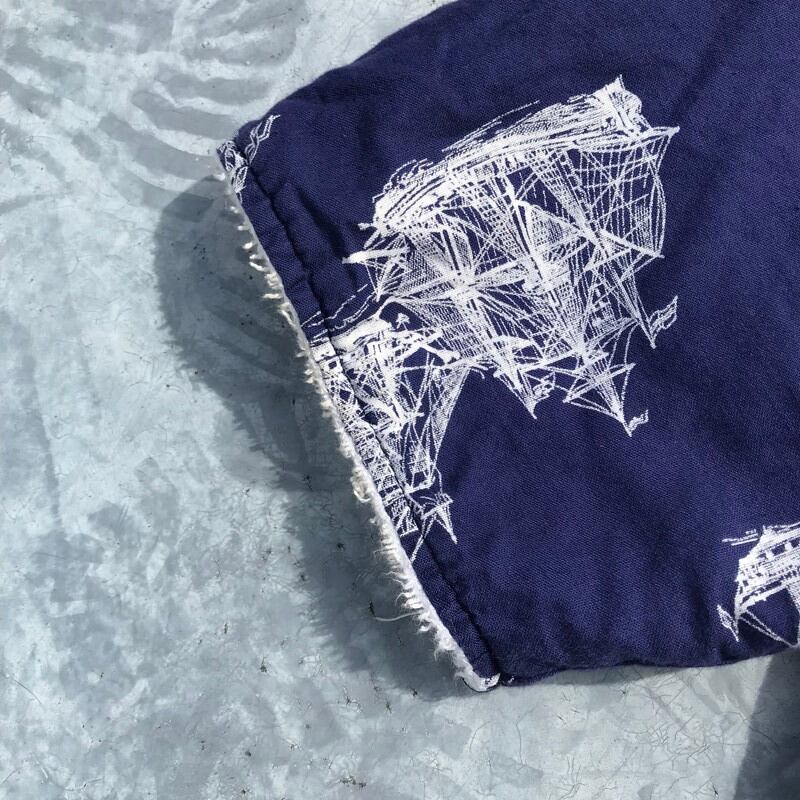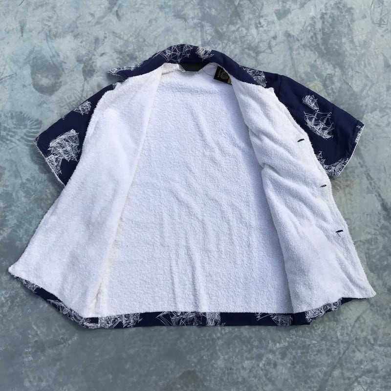 70年代頃のSearsビーチパイルシャツです。サーフィンブームが到来した60年代から70年代にかけて様々なメーカーがビーチウェア等を製造し、このビーチシャツもその頃に販売されていたのでしょう。大海を彷彿させるネイビーボディに全面に帆船が描かれ、裏地の白いパイル地と相まってとても夏らしい1着です。ボタンはゴールドメッキにタツノオトシゴが描かれたユニークなボタンです。使用感や薄汚れはございますが、大きなダメージも無く良好です。ビーチシャツは水辺からあがって濡れたままでも着用でき、海やプールで重宝します。もちろんタウンユースとしてもお洒落ですので、ショーツ等と合わせてみてはいかがでしょうか?