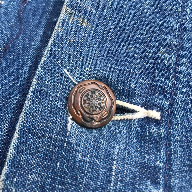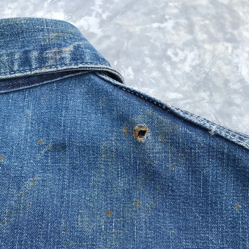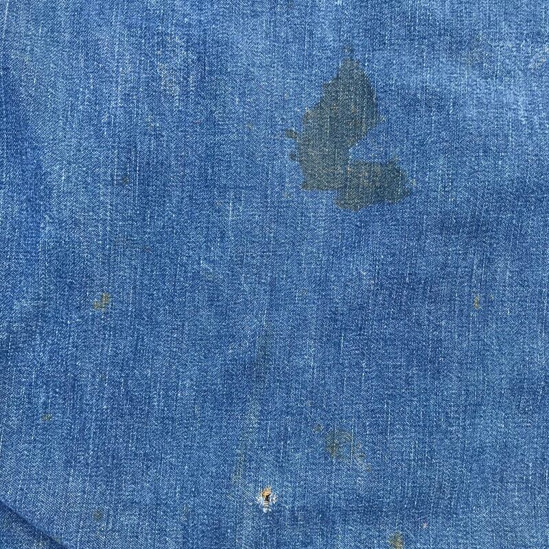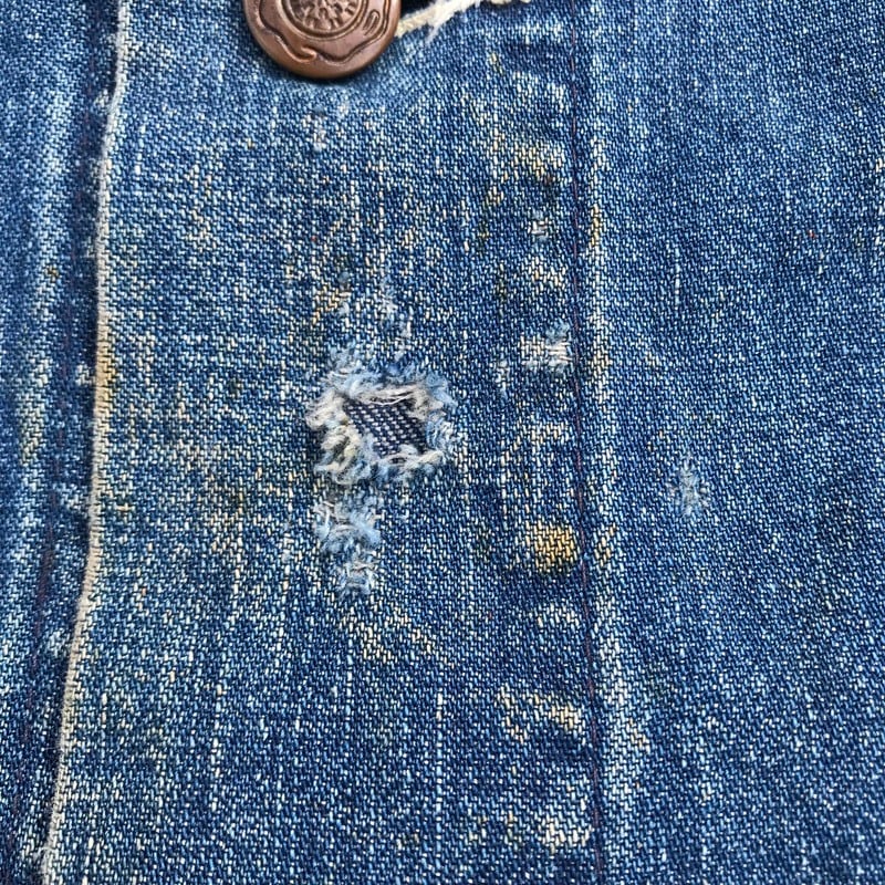 50年代から60年代頃のデニムカバーオールです。メーカー名は不明で、胸元に防縮加工を意味するSANFORIZEDのタグが縫い付けられております。ディティールはBLUEBELL社のカバーオールに酷似しておりますが、定かではございません。全体に程よく色落ちしており、アタリや汚れがヴィンテージならではのふんいきを醸し出しております。胸ポケットにピンホール、前立てに2箇所ダメージ有り、右肩後ろと背面裾あとりにも5mm程の穴がございます。袖口もスレがありますが、使用に支障はございません。あまり出てこない38位のゴールデンサイズですので、お探しだった方におすすめな1着です。