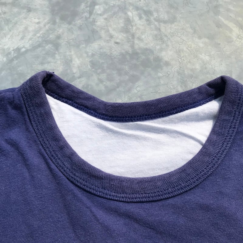 80's頃のチャンピオンリバーシブルTシャツです。前面にRNナンバーが印字されているのでトリコタグの後期頃のモデルではないでしょうか。ネイビーにホワイトでシンプルな組み合わせです。リバーシブルTシャツは元はUSNがチャンピオンに依頼して紅白戦に使用したのが始まりと言われています。全体に使用感があり、リバーシブルTeeによく見られる捻じれもありますが、目立つダメージはございません。アメカジの定番ともいえるアイテムですので、おススメです。