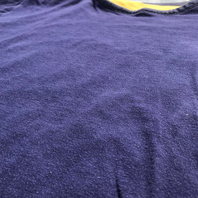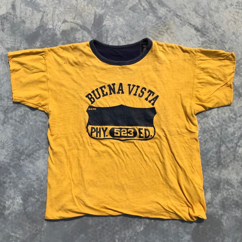 60年代頃のチャンピオンリバーシブルTシャツです。ランタグの中でも後期頃のランナーがCマークの中にあるインCと呼ばれるタイプです。アメリカはバージニア州にあるBUENA VISTAのカレッジTと思われます。イエローネイビーのゴールデンカラーでアメカジ好きには堪らない配色ですが、リバーシブルTee独特の捻じれや縮みが有るため着丈は短めです。左裾、左後ろ、首元に小穴やダメージがございます。全体に使用感や汚れた箇所はございますが、首元のフェード具合等、育て甲斐のある1着です。
