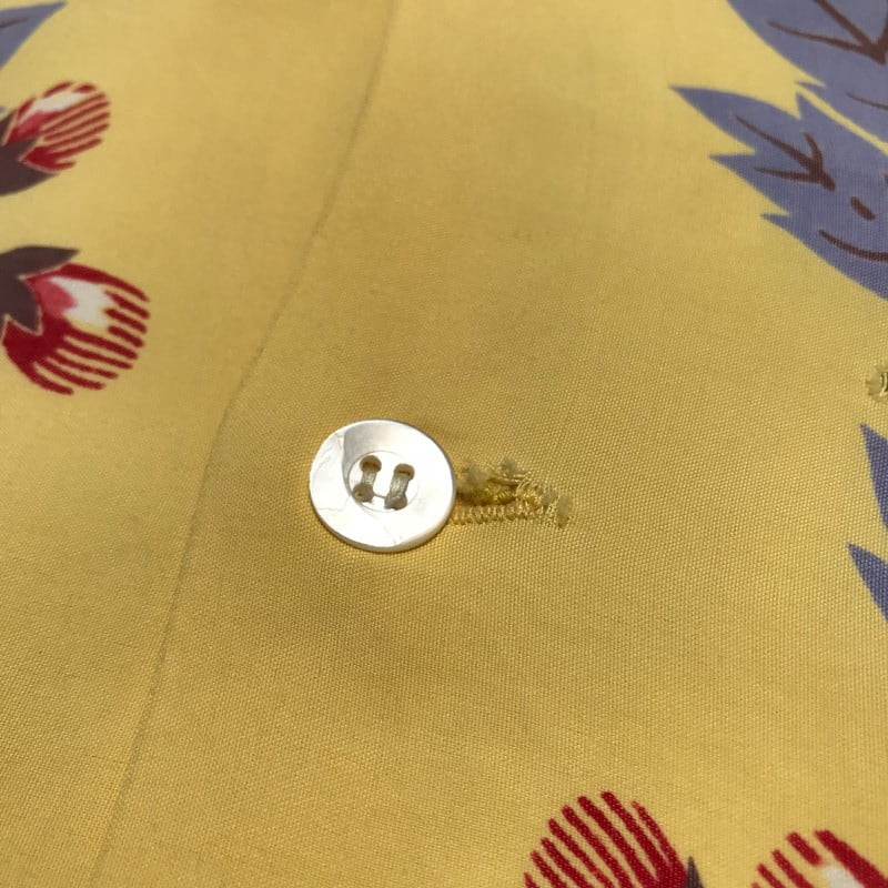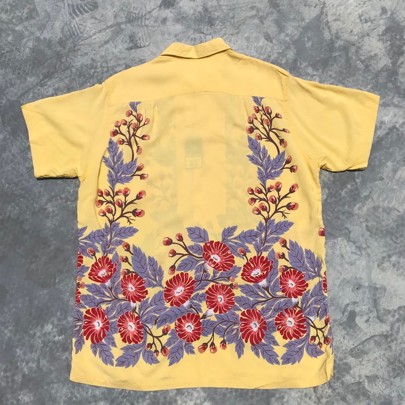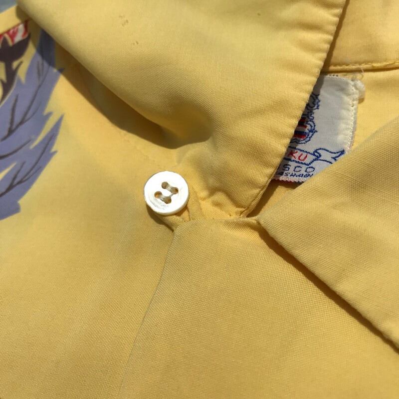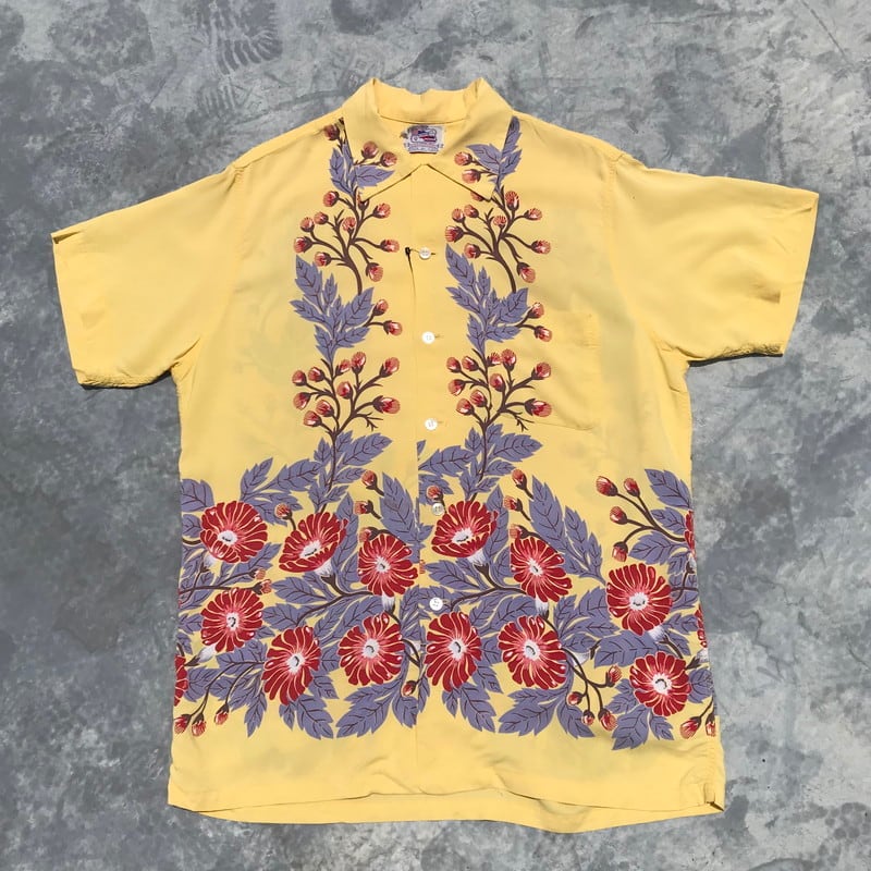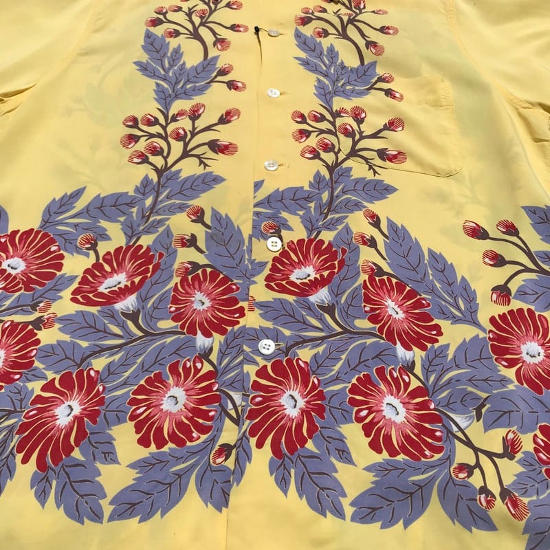 50年代頃のデュークカハナモクレーヨンアロハシャツです。名作のMORNING GROLY(朝顔)と同様のホリゾンタルパターンでガーベラがプリントされています。淡いレモンイエローとのカラーバランスが絶妙な1着です。ボタンは全てシェルボタン、胸ポケットもしっかりと柄合わせされています。両袖に1箇所づつ、胸ポケット付近にピンホールが2箇所ございます。首元のタグがほつけています。使用感はございますが、全体的に状態も良く、なかなか出会わないGOODプリントですので、アロハシャツコレクションにいかがでしょうか。