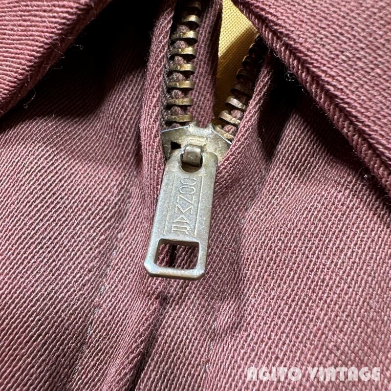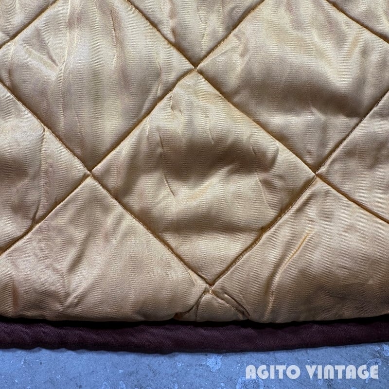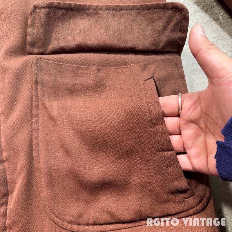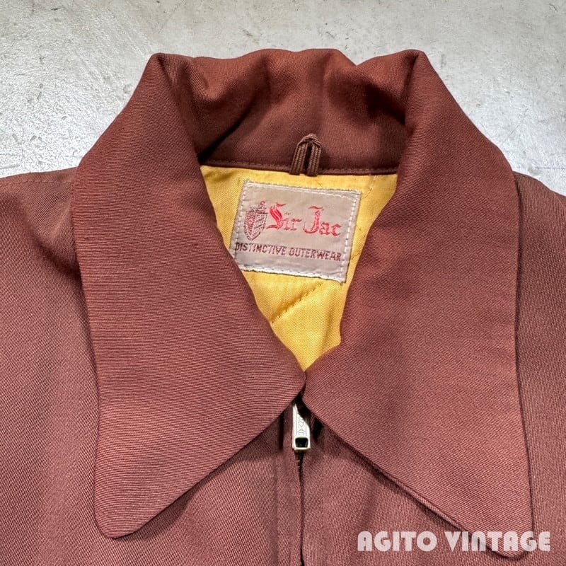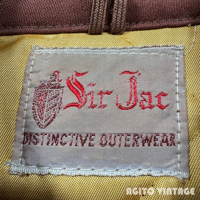 60年代頃のSir Jac レーヨンギャバジンジャケットです。Sir Jacは1871年に創業したCharles Zimmerman Companyが1895年に社名を変更したStahl-Urban Companyが展開していたブランドです。ドリズラージャケット等で有名なので一度は目にした事があるのではないでしょうか。ご紹介するこちらはレーヨンギャバジン地に中綿キルティングが施されたアウターウェアで、一般的なギャバジャン等に比べると少し着丈の長いタイプです。CONMARジッパーが採用されています。フラップ付きポケットのサイドからも手を入れる事ができるスラッシュポケットもございます。腰の両サイドにはボタンが付いているので元はハーフベルトが付いていたのかもしれません。こちらは肩パッドが入る仕様です。ごく僅かな色褪せ等はございますが、使用感は少なく内側のサテン地も非常に綺麗です。デッドストックから数回着用しただけのようなミントコンディションです。ポケット内側の髪タグが切れてしまっていますがM相当かと思われます。コンディションの良いギャバジャンなどお探しだった方は是非この機会にいかがでしょうか。