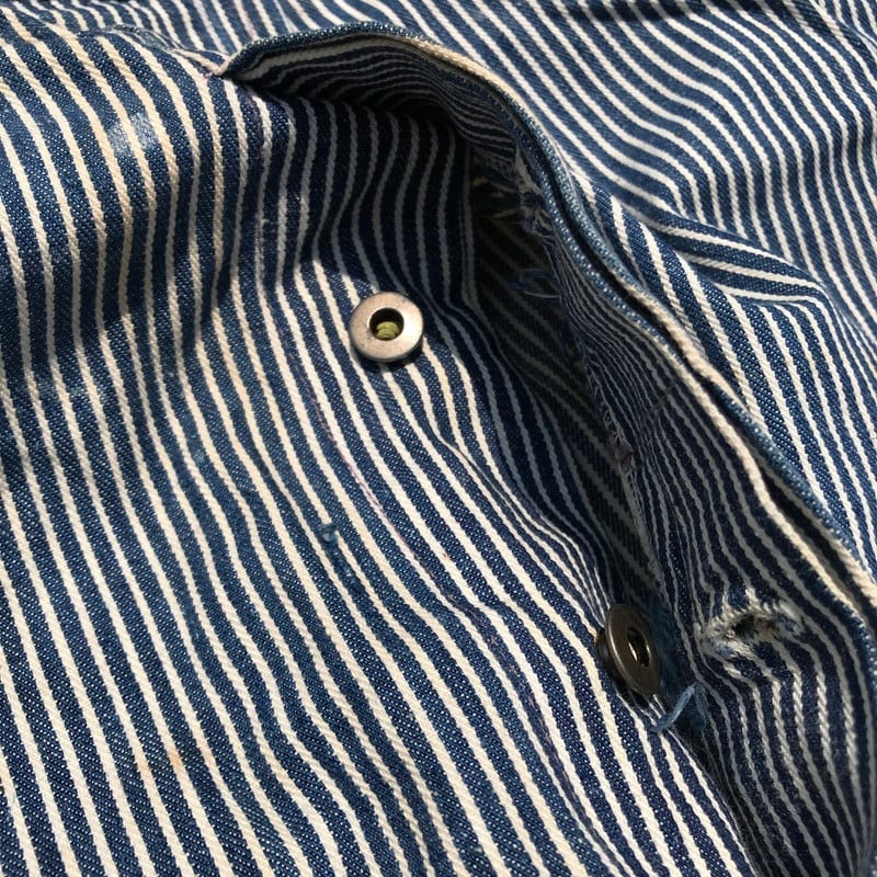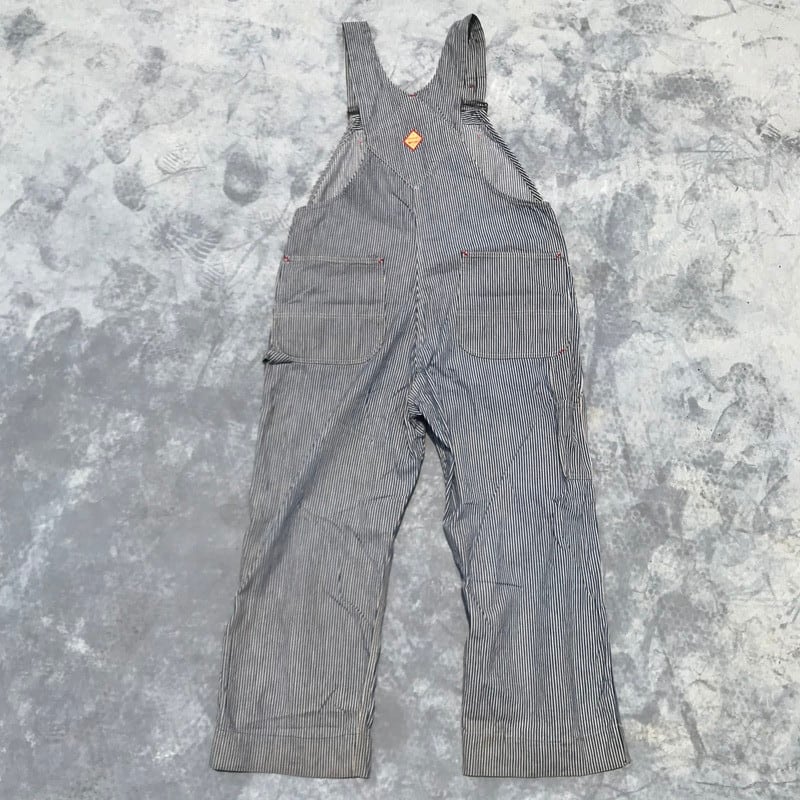 50年代頃のPAY DAYヒッコリーオーバーオールです。アメリカを代表する3大ストアのJC Pennyが展開するプライベートブランドです。人気のヒッコリー地で、白紺の40年代のタグから移行した3色タグで50年代の物と思われます。PAY DAYの刻印ボタン、フライはドーナツボタン、右ハンドポケット内側にユニオンチケットがございます。ペンキや薄汚れが所々ございますが、大きなダメージはございません。レングスも短めですが、5cm位なら折り返し部分を伸ばせそうです。W42とゆったりめですが、オーバーオールは通常のボトムより大きいサイズでも合わせやすいので良いサイズ感でおススメです。