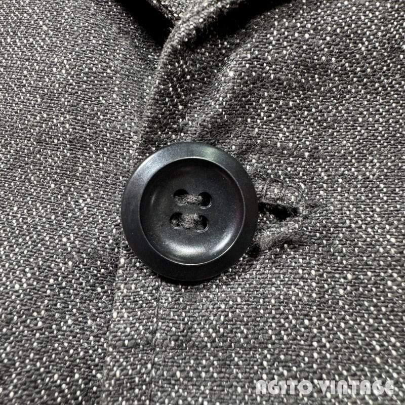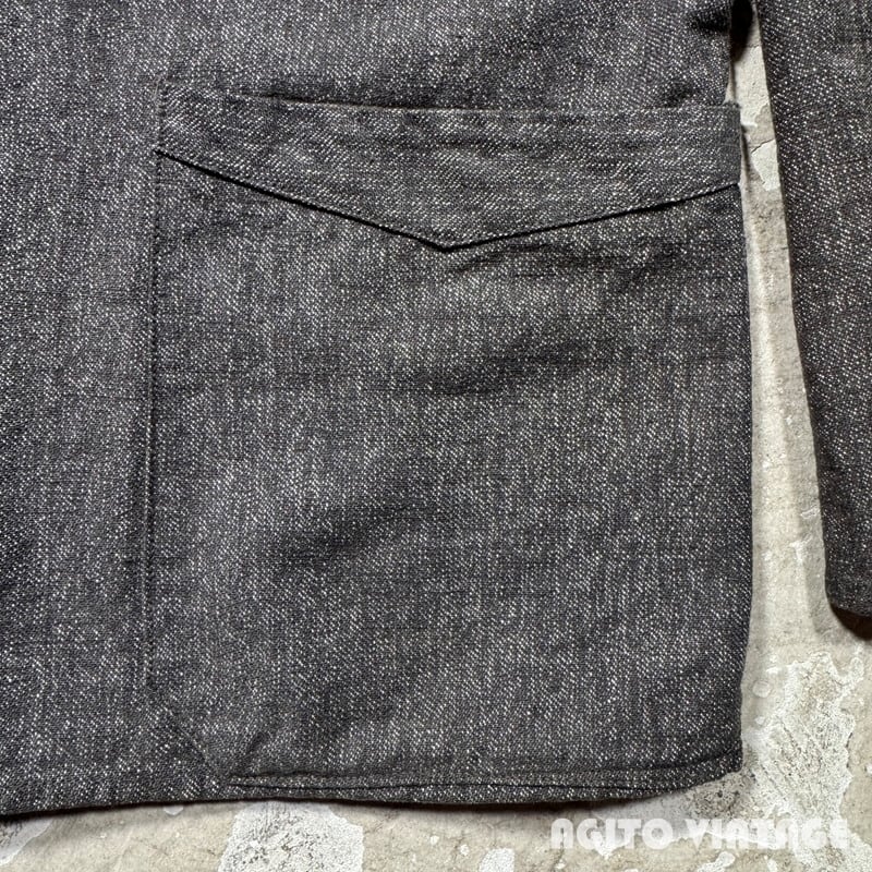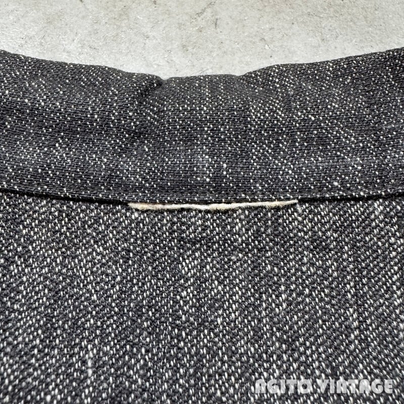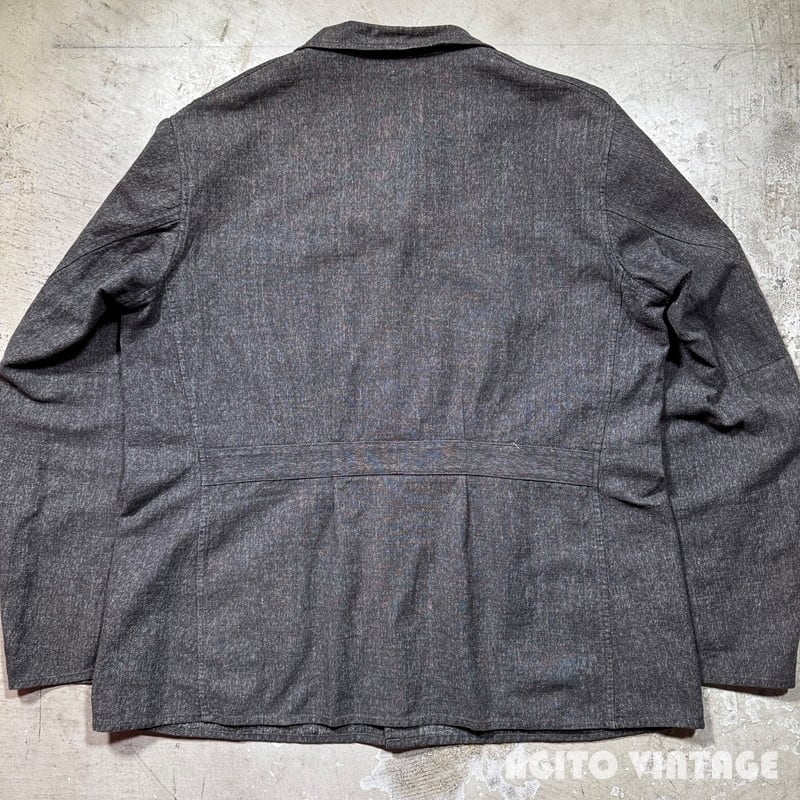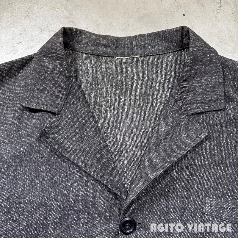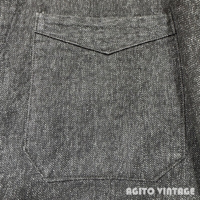50年代から60年代頃のUnknown ブラックシャンブレーワークジャケットです。首元の紙タグが欠損している為製造メーカーは不明です。フロントは3つボタン、ポケットも3つ配置されています。古いフレンチワークジャケットにも見られるVポケット仕様です。背面には腰帯がありプリーツがございます。各ディティールからフレンチワークかと思われます。襟に薄汚れが見られますがその他目立つダメージ等無くコンディションは良好です。タグはございませんが実寸でM相当かと思われます。シンプルながらも古き良きワークウェアらしい1着でオススメです。