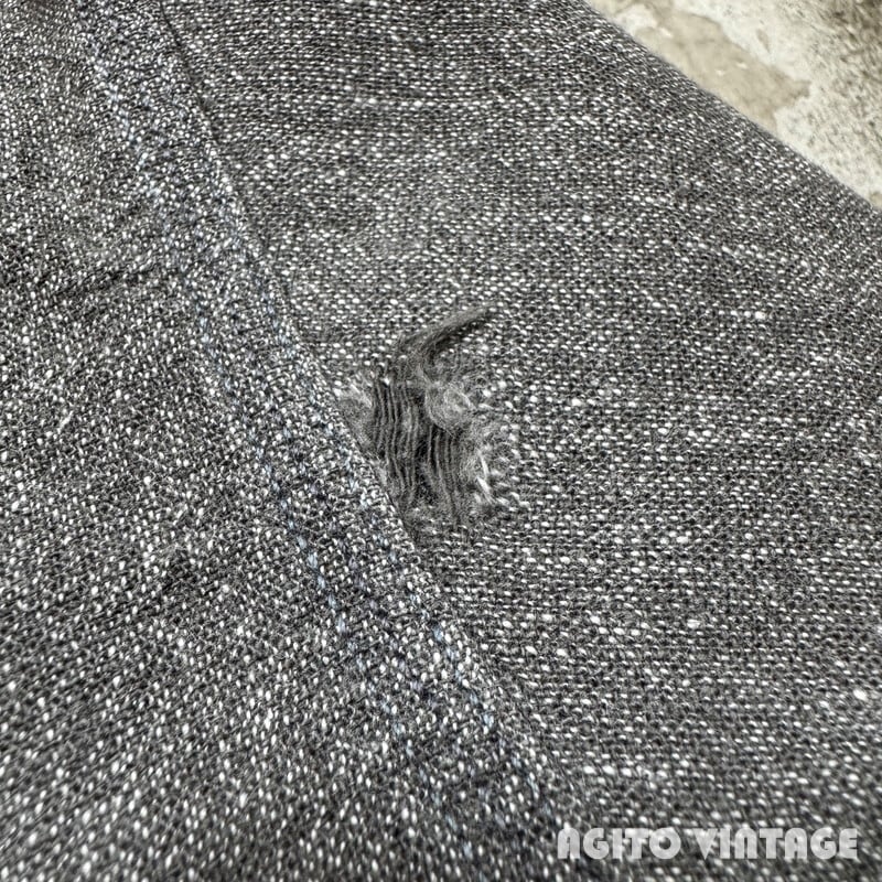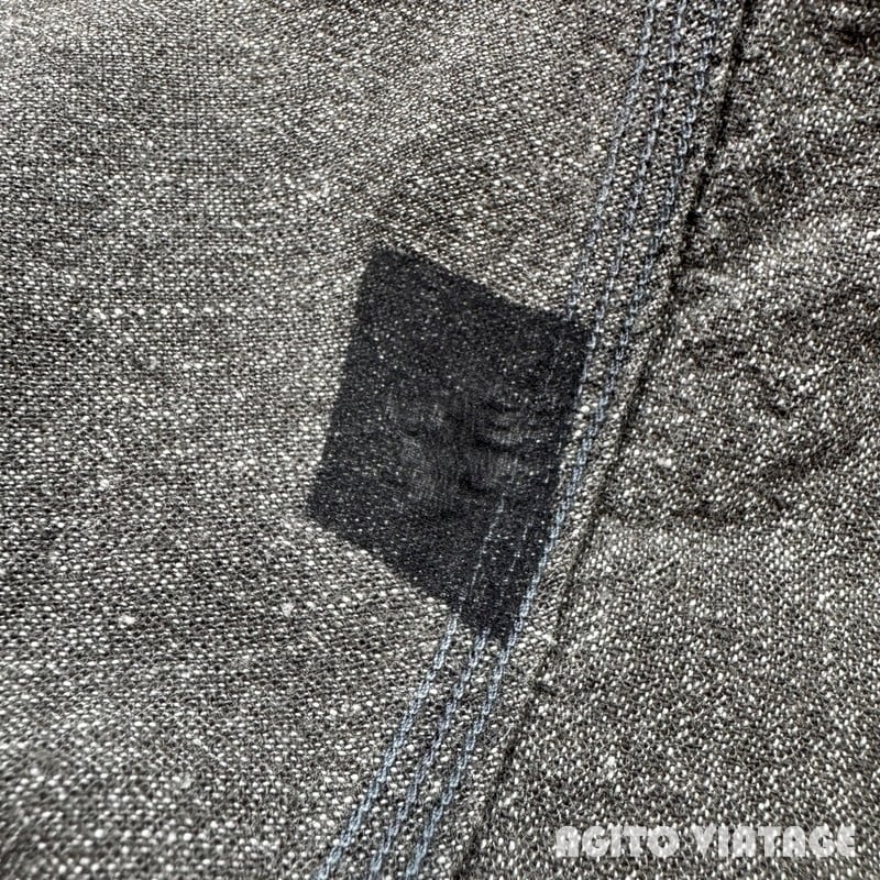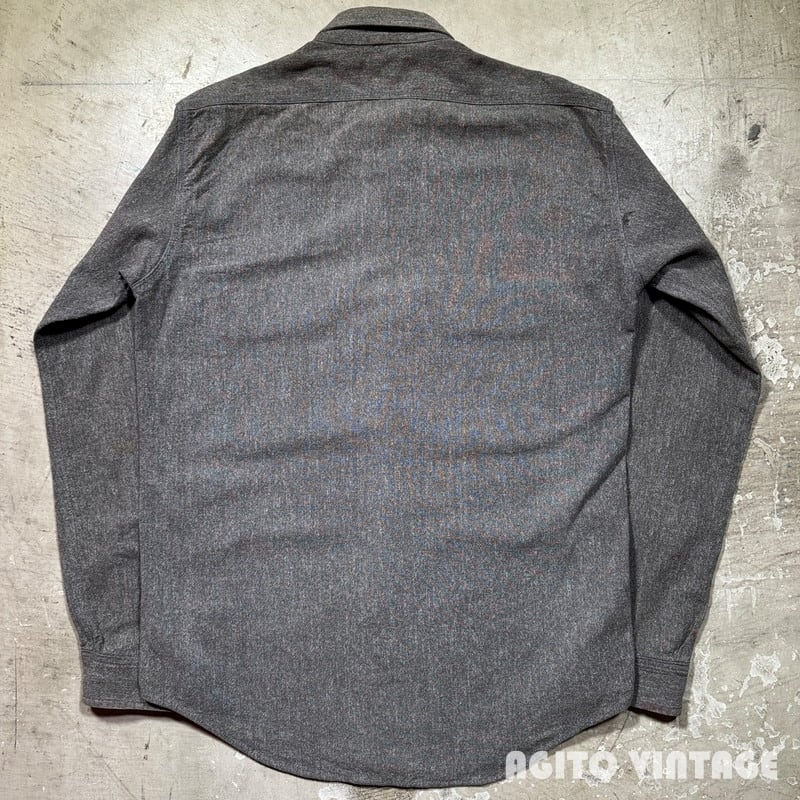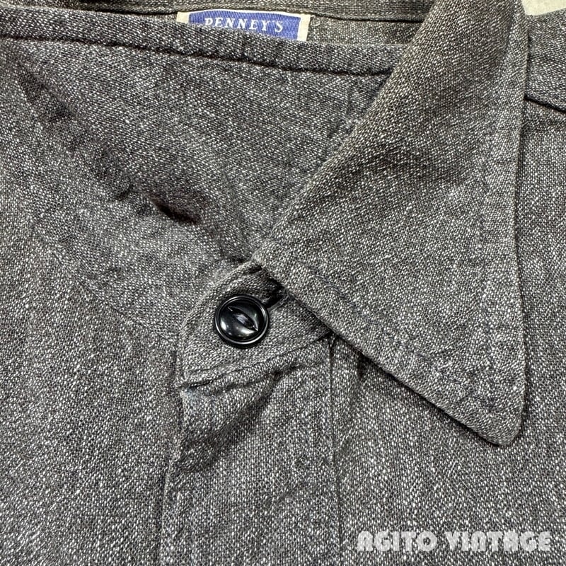 50年代頃のBIG MAC ブラックシャンブレーワークシャツです。BIG MACはアメリカ3大ストアブランドとして有名なJCPennyのプライベートワークブランドです。ご紹介するこちらのアイテムは、ヴィンテージワークウェアで人気の高いブラックシャンブレーを使った1着です。台襟が付き全て猫目ボタンが使用されています。こちらはサイドにマチの付かないタイプです。両袖先にペンキ汚れがございます。裾に一部ステッチの解れがあり付近に小さなダメージがございます。右袖背面付け根に小さなダメージがあり広がらないように薄い接着芯で補強が施されています。その他フロントや袖に薄汚れ等ございますがコンディションは良好かと思います。サイズの表記が確認できませんがおおよそS~M相当です。オーバーオールのインナーに着てもカッコ良いですし、古いワークチノと合わせても渋いのでお探しだった方は是非この機会にいかがでしょうか。